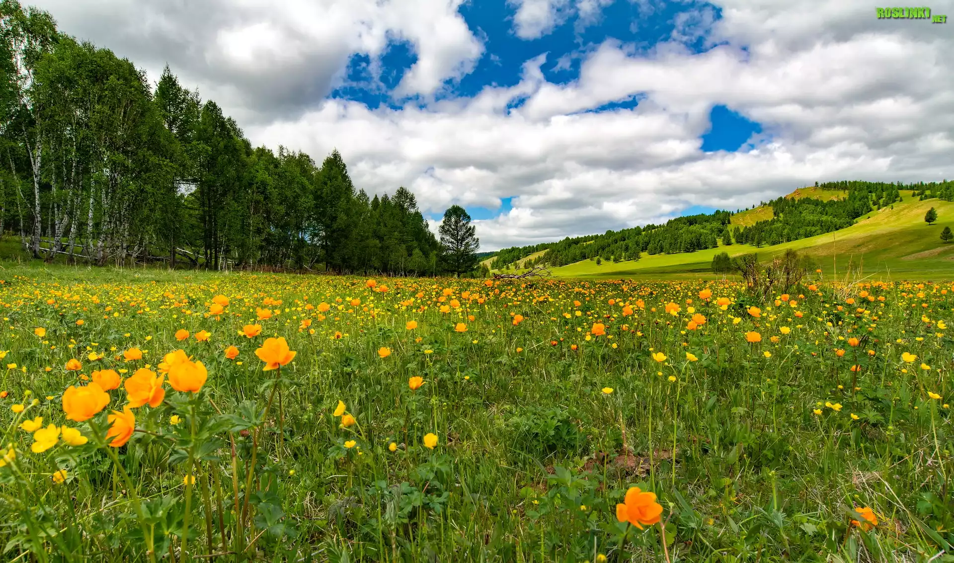 Rośliny: Wzgórza, Drzewa, Łąka, Niebo, Żółte, Kwiaty, Jaskier, Lato