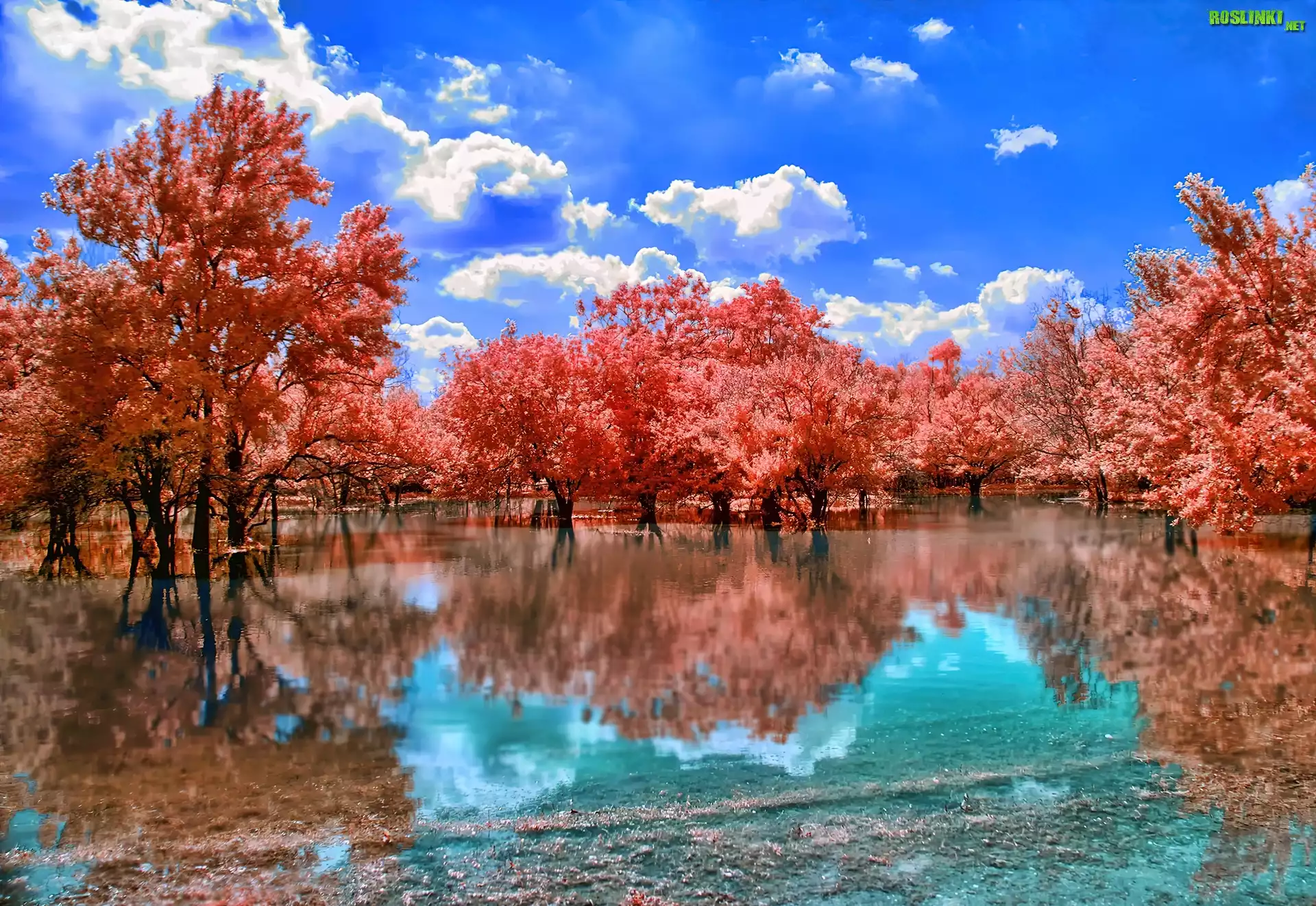 Rośliny: Drzewa, Czerwone, Liście, Jezioro