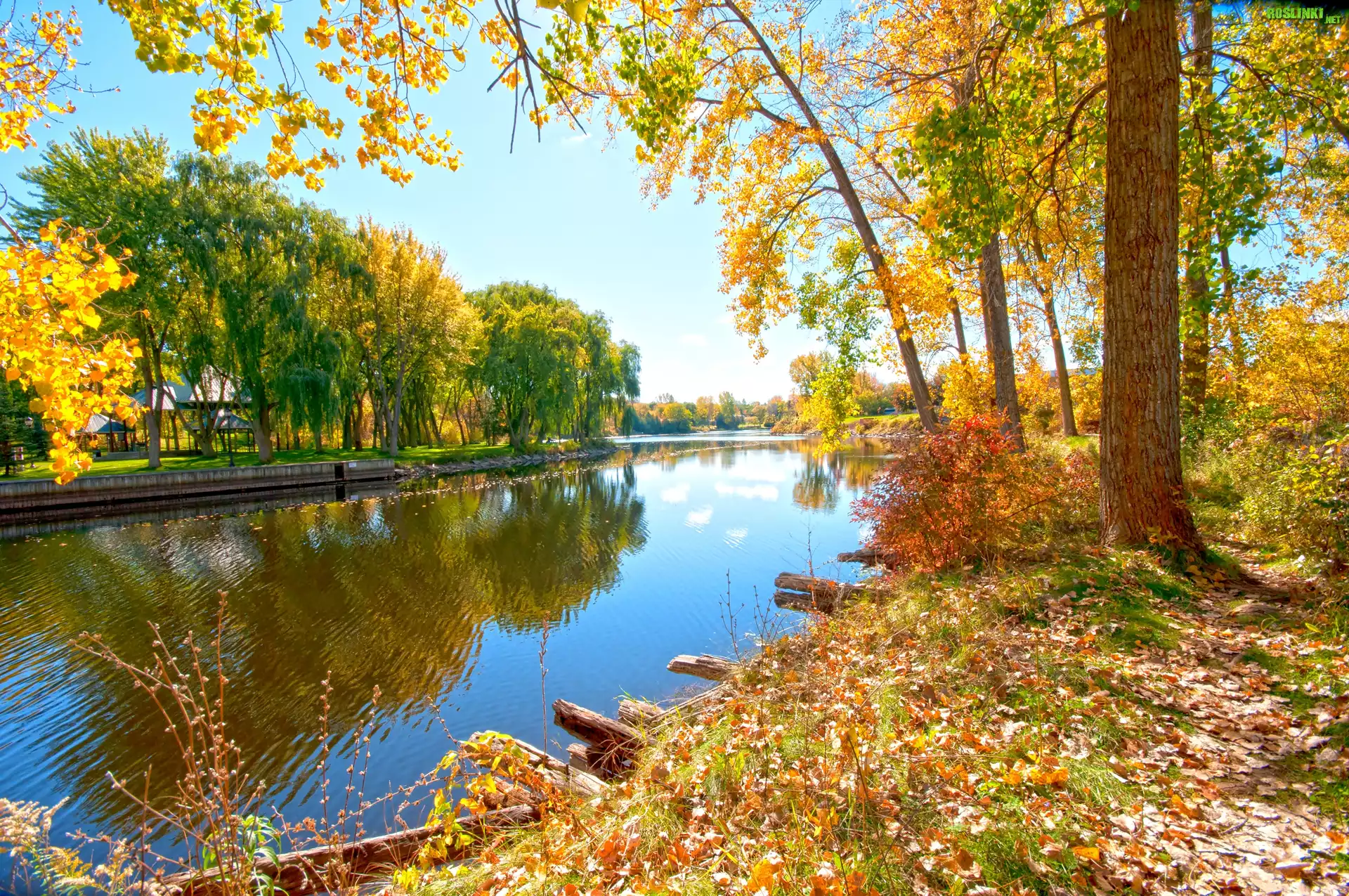 Rośliny: Drzewa, Wierzby, Rzeka, Krzewy, Liście, Odbicie