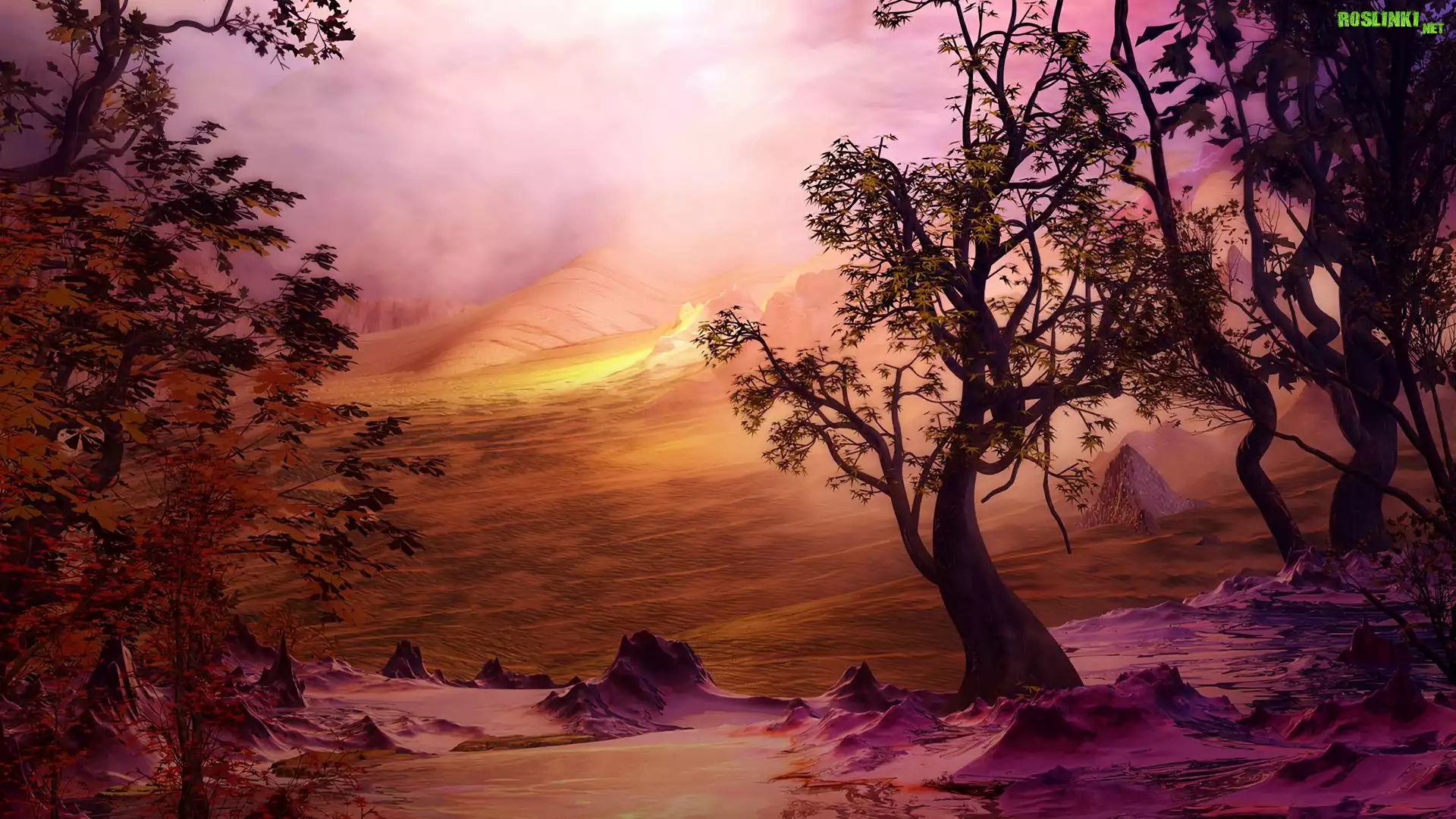 Rośliny: Drzewa, Góry, Mgła, Grafika