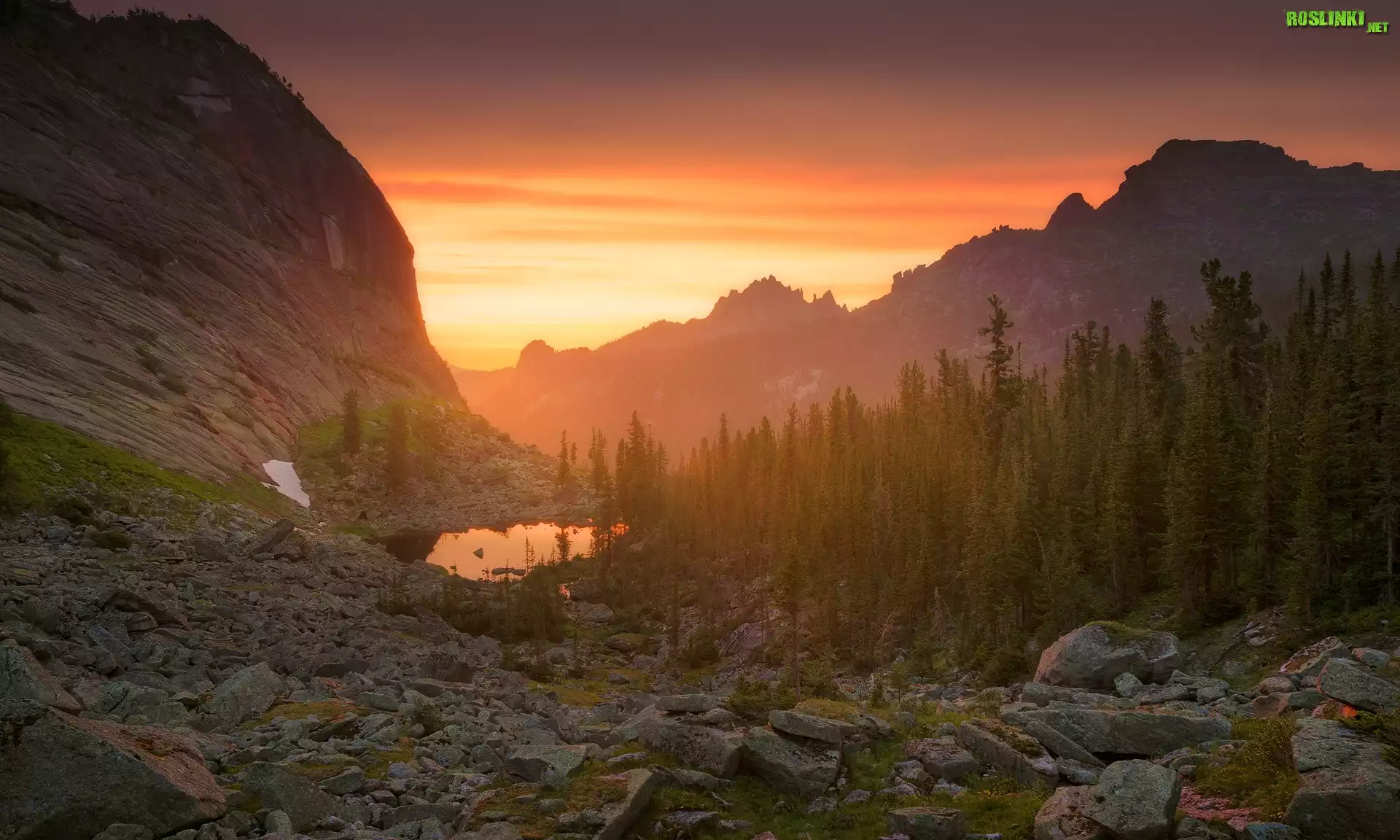 Rośliny: Góry, Drzewa, Jeziorko, Skały, Kamienie, Zachód słońca, Mgła
