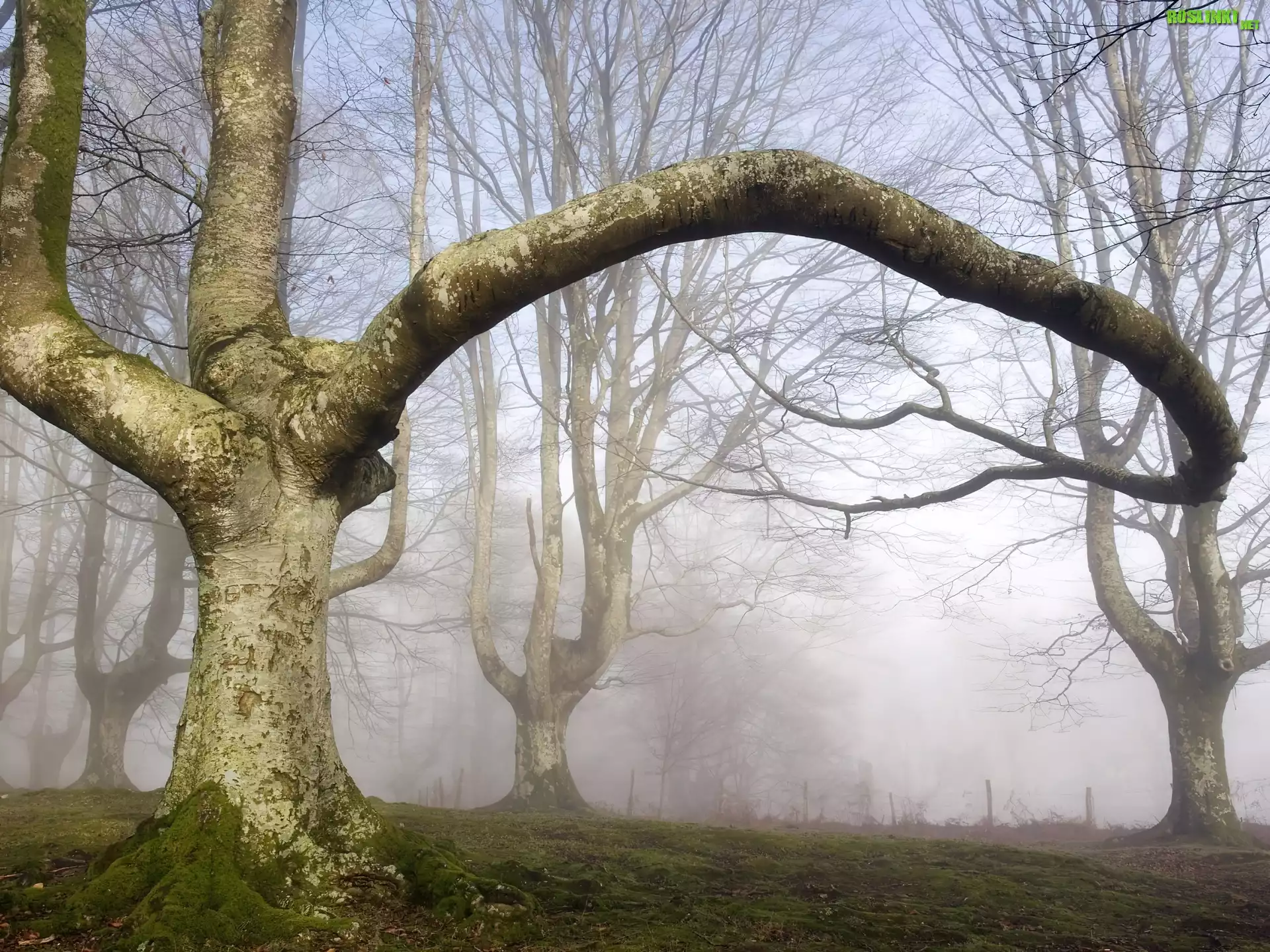 Rośliny: Drzewa, Pochyły, Konar, Mgła, Mech