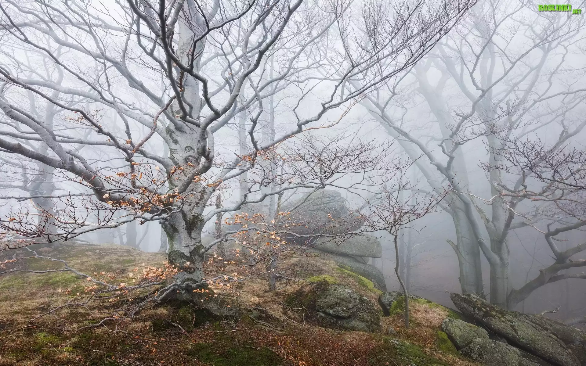 Rośliny: Skały, Drzewa, Mgła, Zamglony, Las