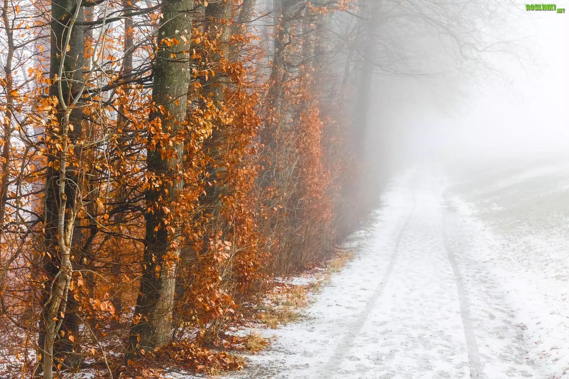 Rośliny: Drzewa, Pożółkłe, Liście, Droga, Mgła, Zima