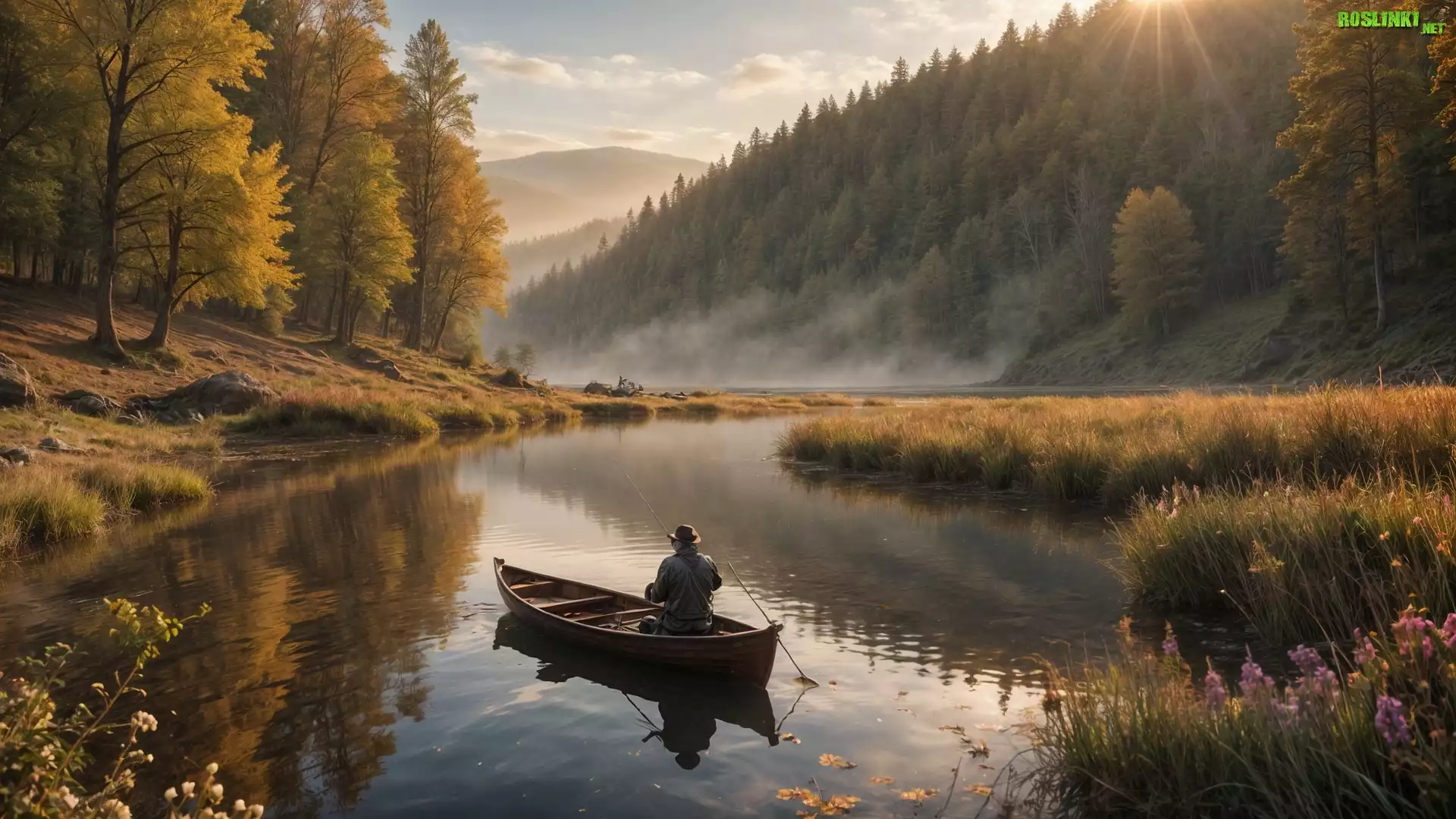 Rośliny: Wędkarz, Jezioro, Łódka, Drzewa, Jesień, Mgła