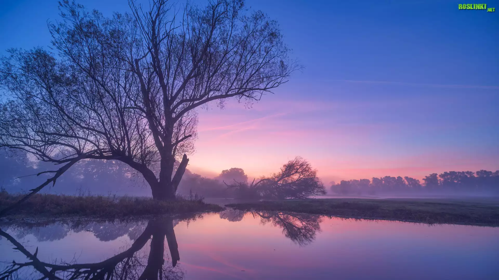 Rośliny: Jesień, Rzeka, Mgła, Drzewa, Odbicie, Poranek, Świt