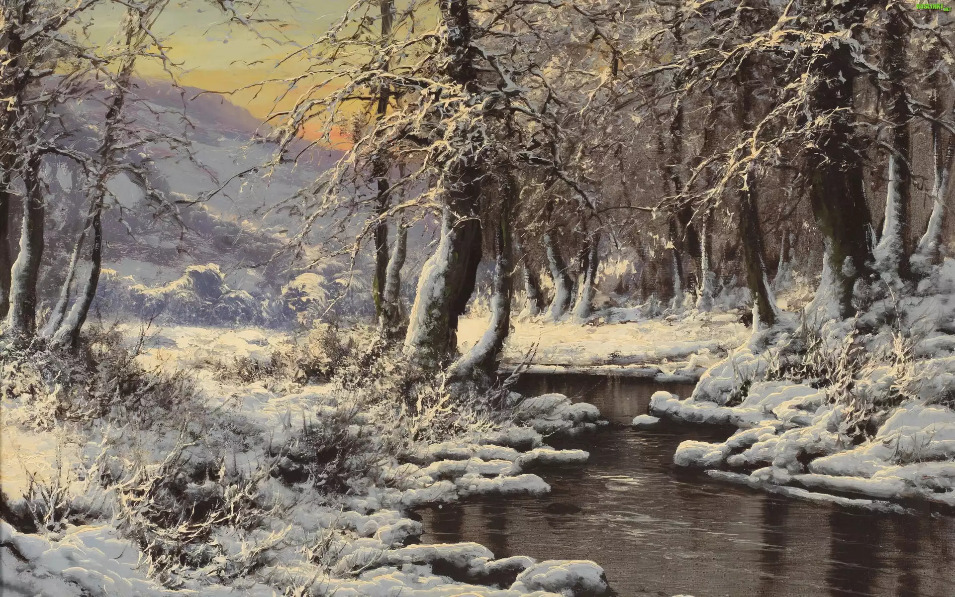 Rośliny:  Malarstwo, Obraz, Laszlo Neogrady, Zima, Rzeka, Góry, Ośnieżone, Drzewa