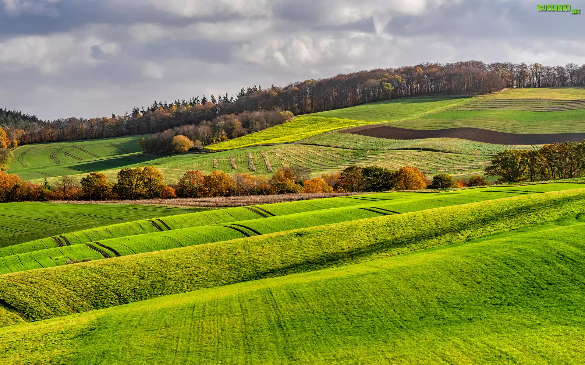 Rośliny: Wzgórza, Pola, Uprawne, Drzewa, Las, Niebo