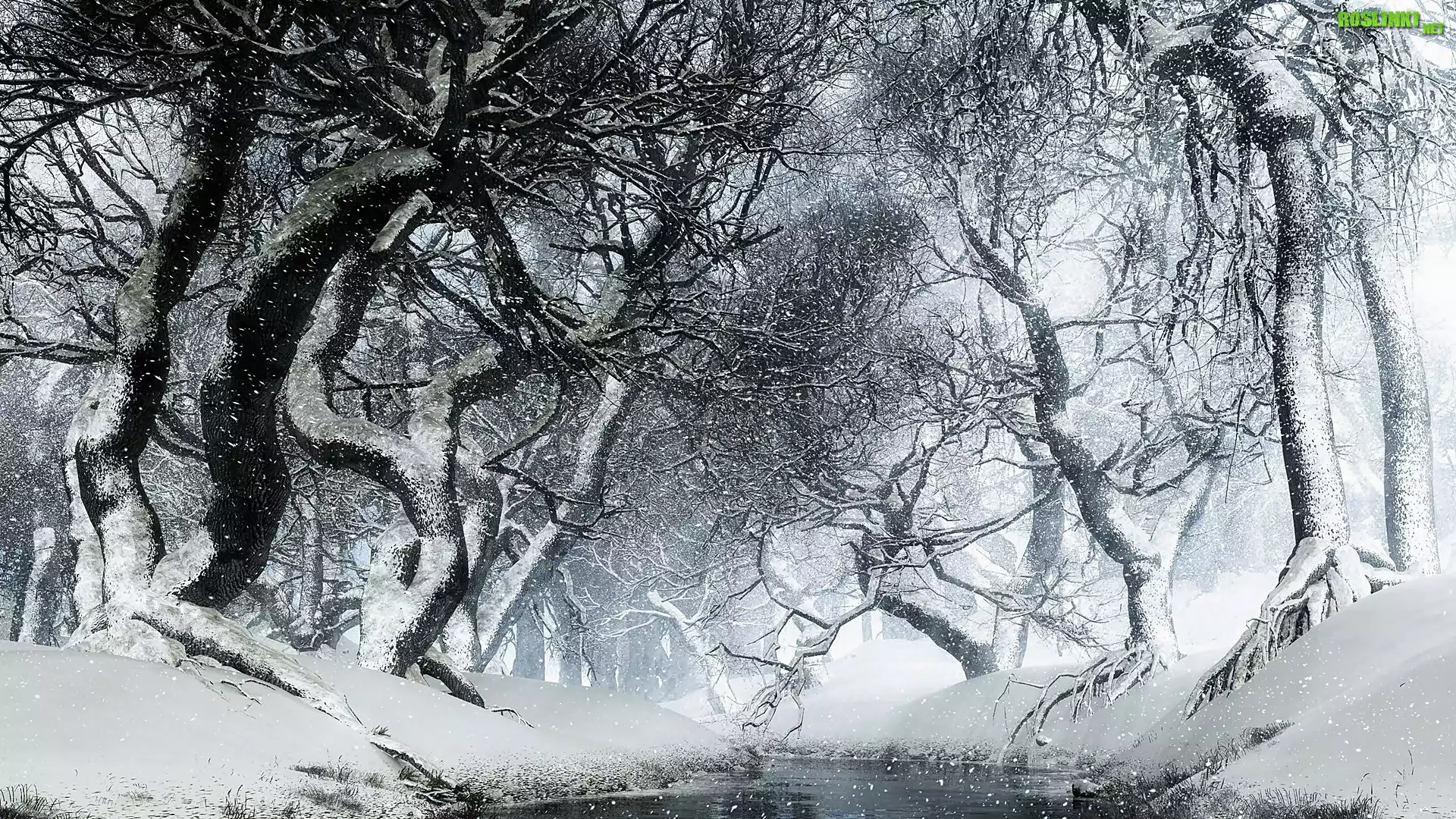 Rośliny: Drzewa, Rzeka, Śnieg, Mgła