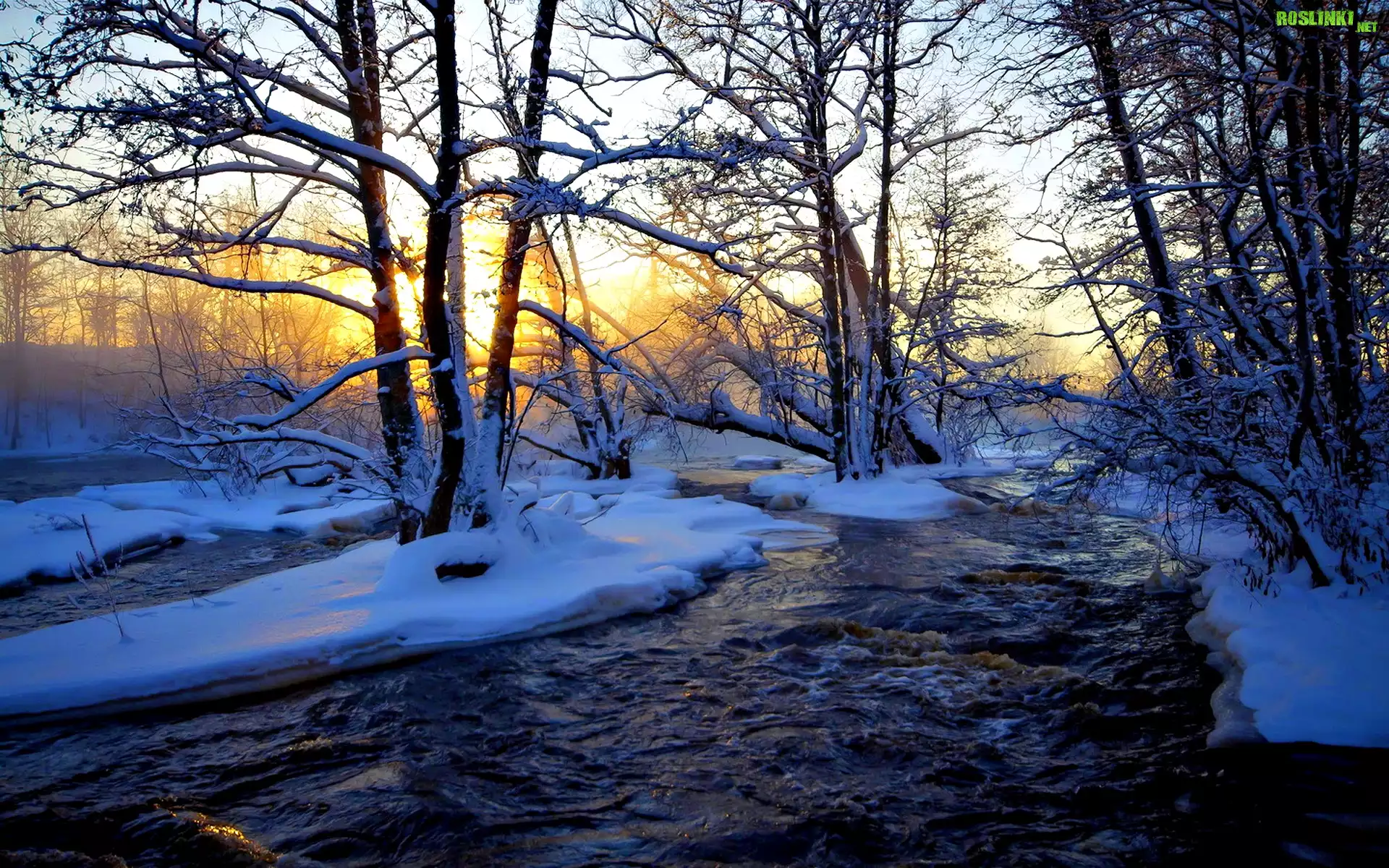 Rośliny: Drzewa, Zachód Słońca, Śnieg, Rzeka