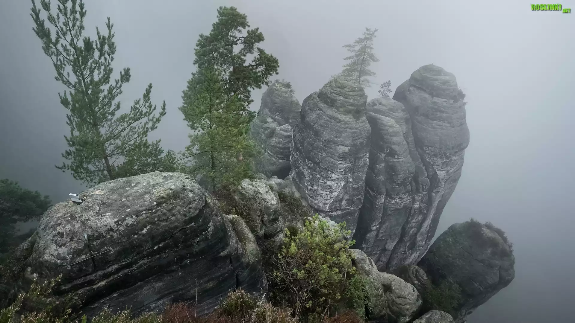 Rośliny: Skały, Drzewa, Mgła, Park Narodowy Saskiej Szwajcarii, Niemcy