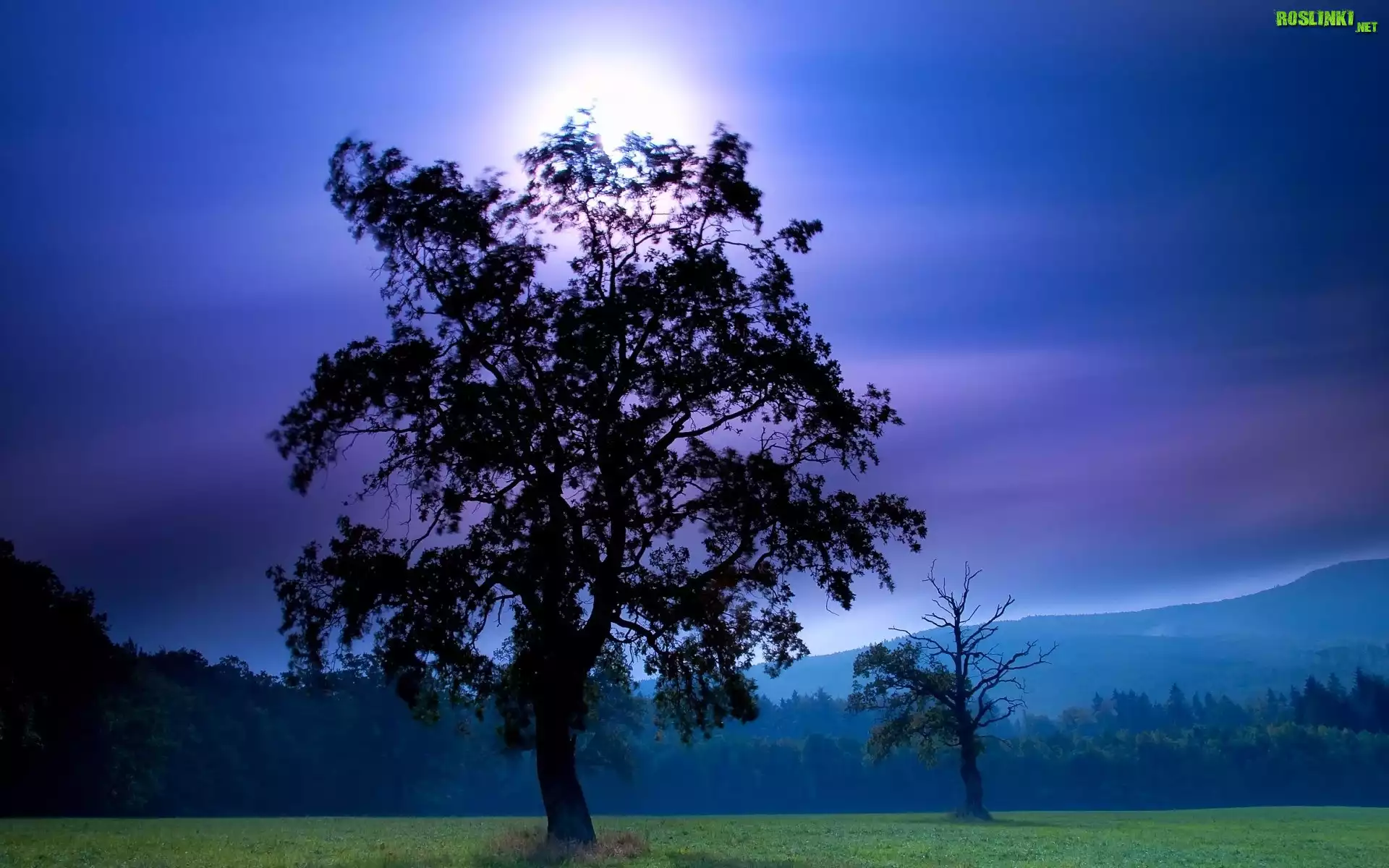Rośliny: Drzewa, Góry, Noc, Księżyc