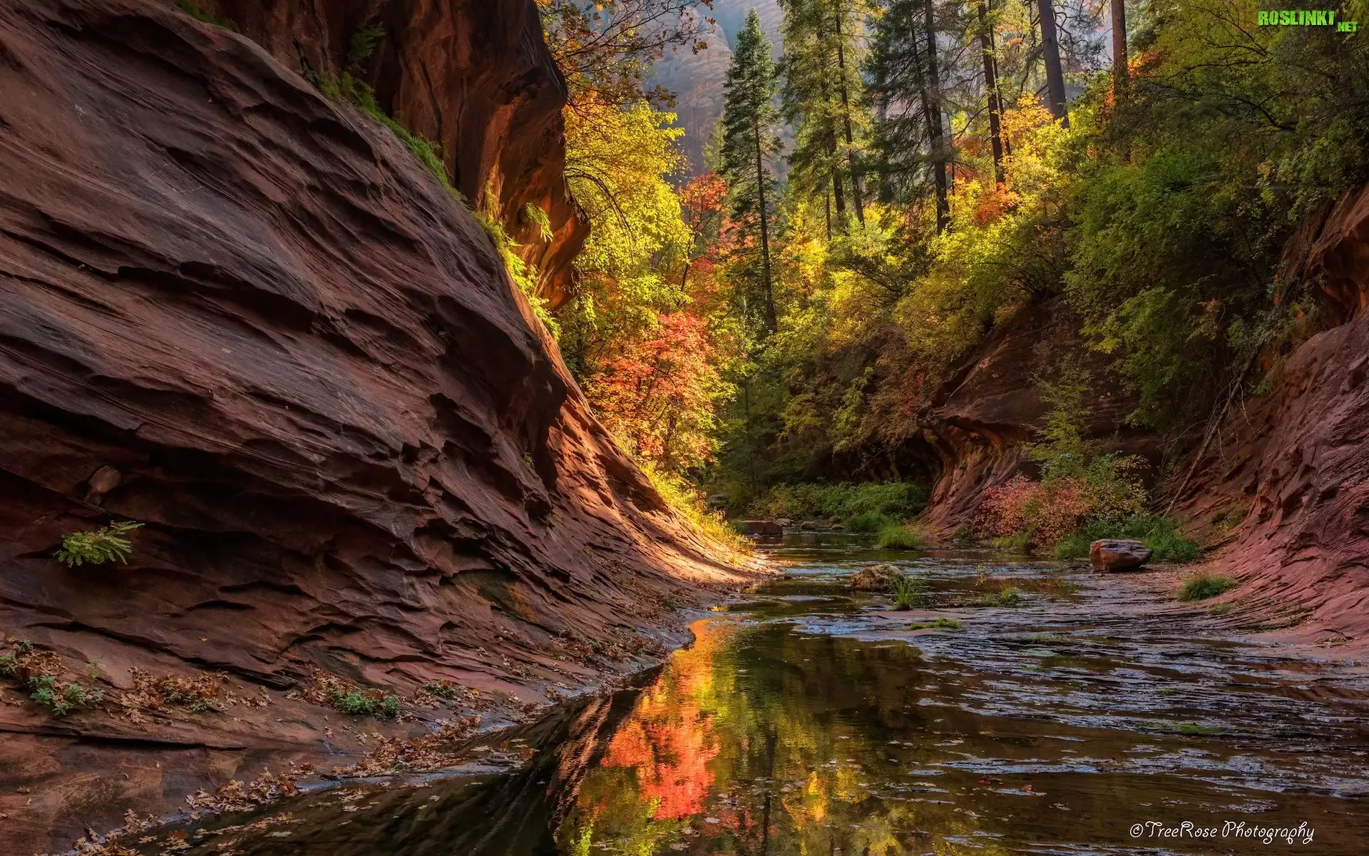 Rośliny: West Fork Oak Creek, Sedona, Arizona, Stany Zjednoczone, Jesień, Drzewa, Rzeka, Skały