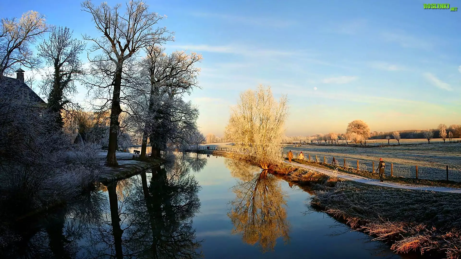 Rośliny: Dom, Drzewa, Rzeka, Droga, Pola, Przebijające, Światło, Odbicie