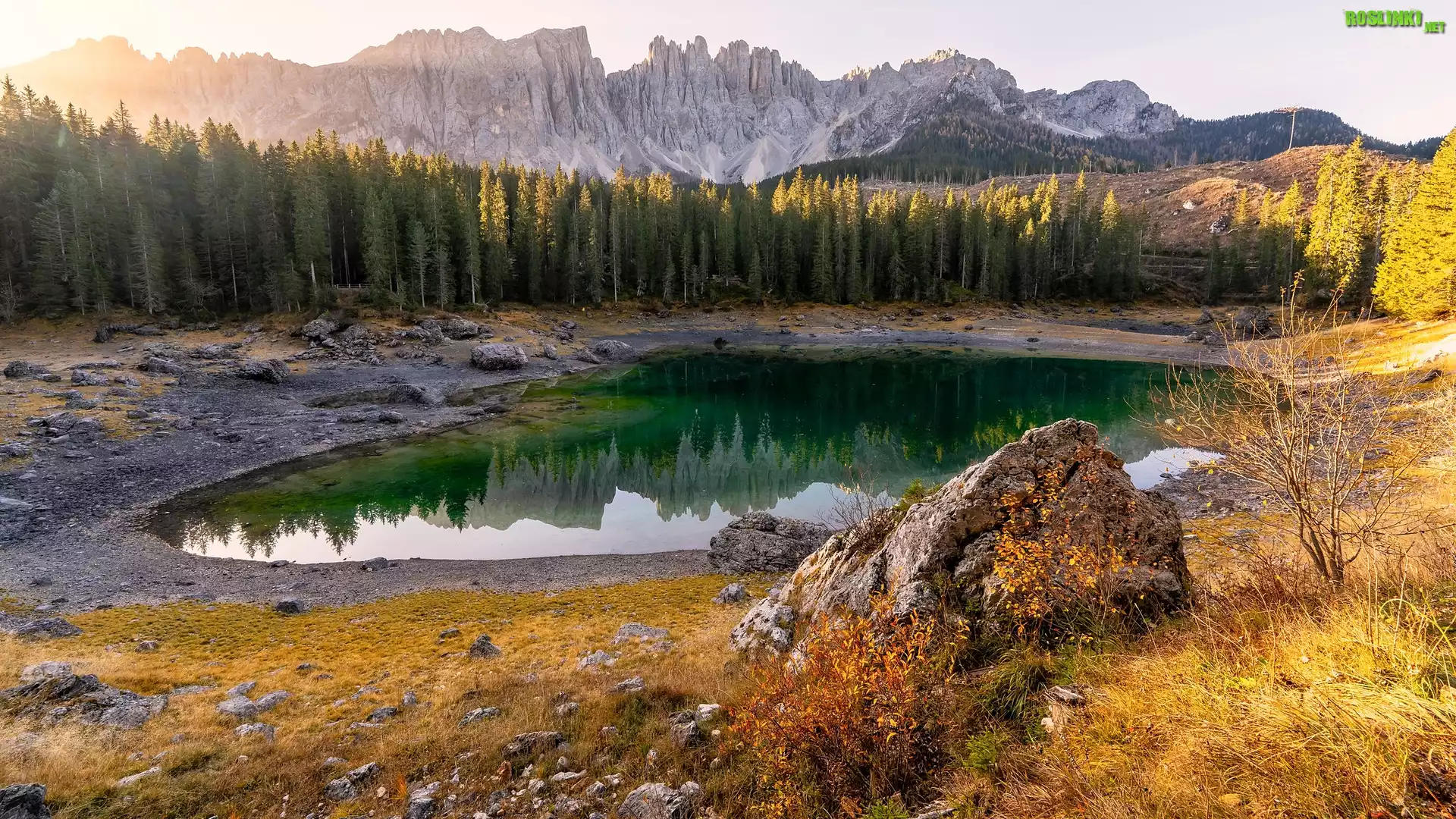 Rośliny: Jezioro, Lago Karersee, Carezza, Góry, Dolomity, Drzewa, Odbicie, Południowy Tyrol, Włochy