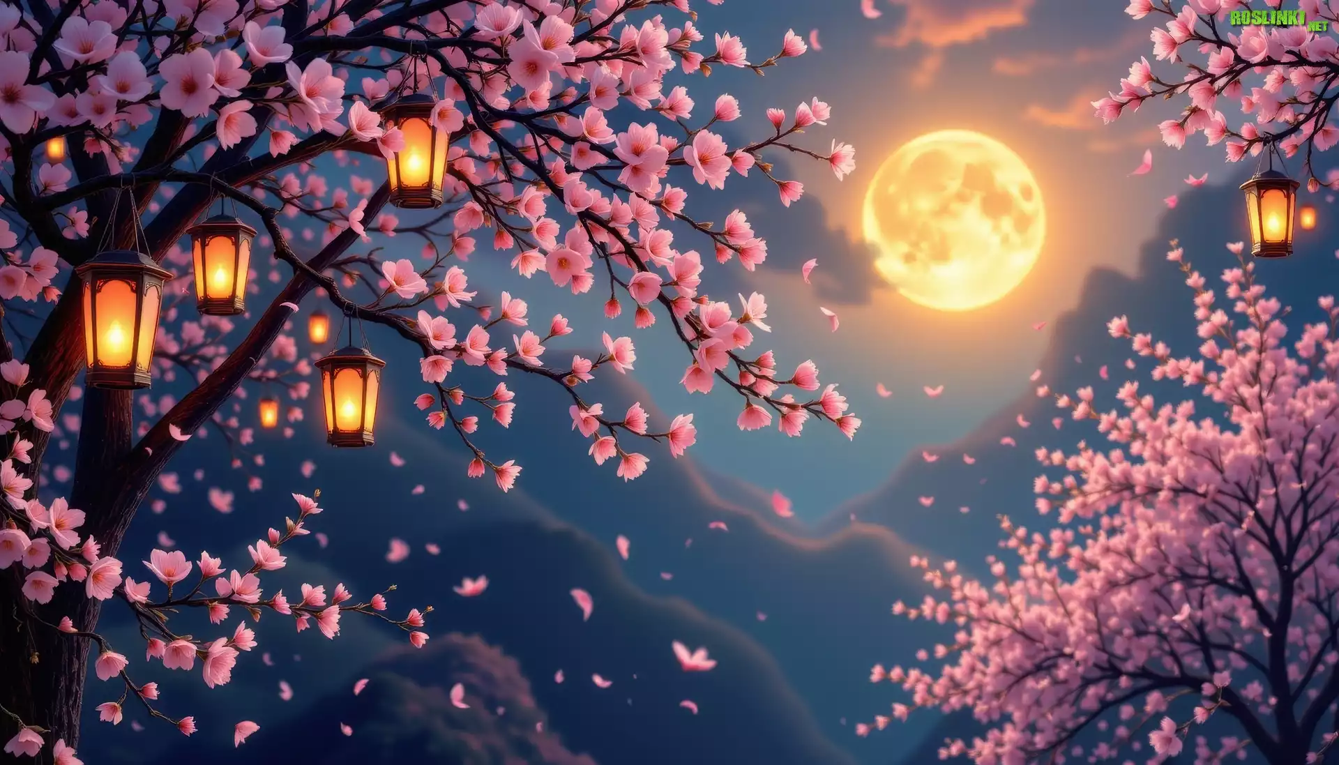 Rośliny: Noc, Latarnie, Okwiecone, Drzewa, Księżyc, Grafika AI