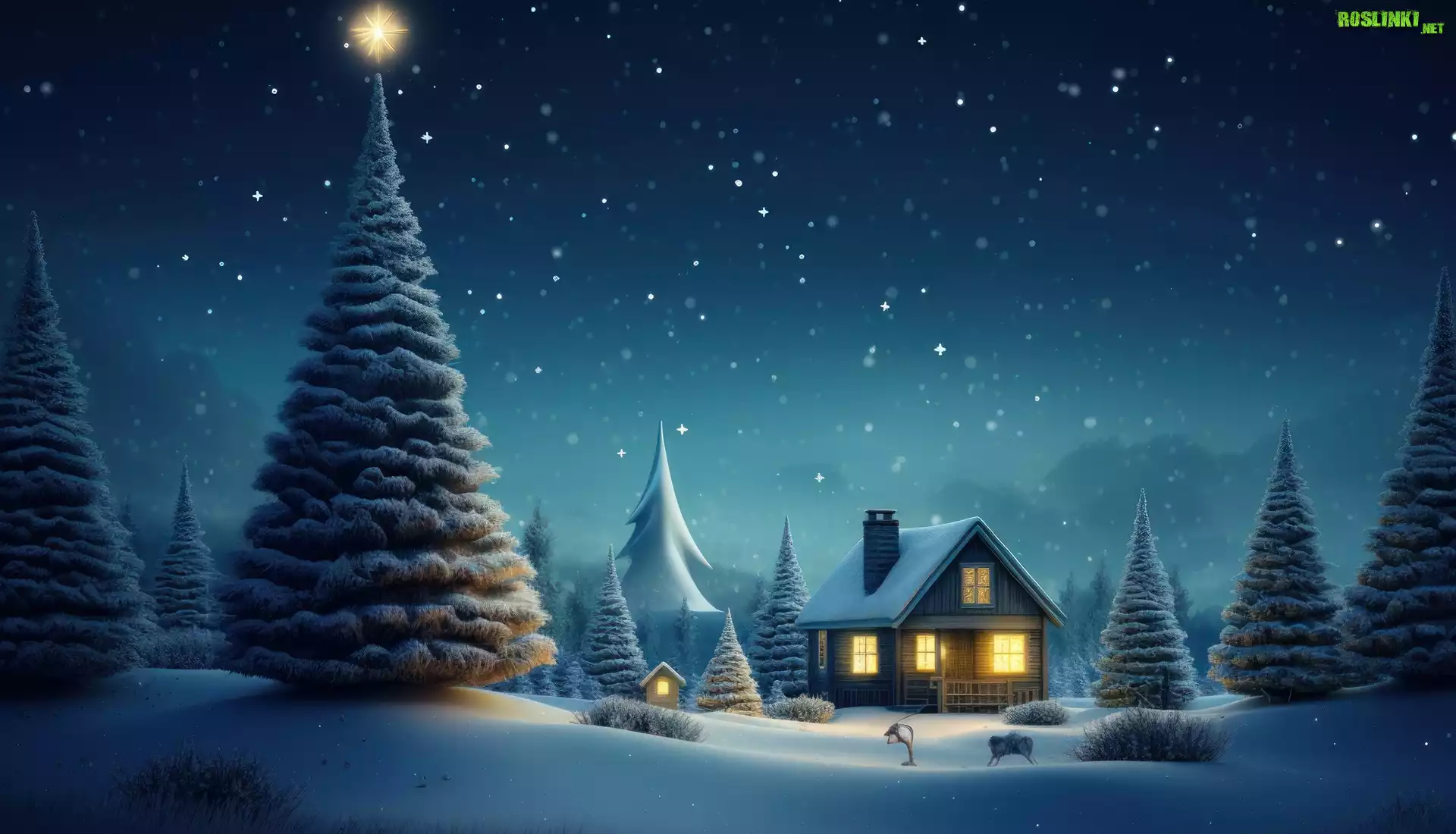 Rośliny: Zima, Dom, Ośnieżone, Drzewa, Gwiaździste, Niebo, Grafika