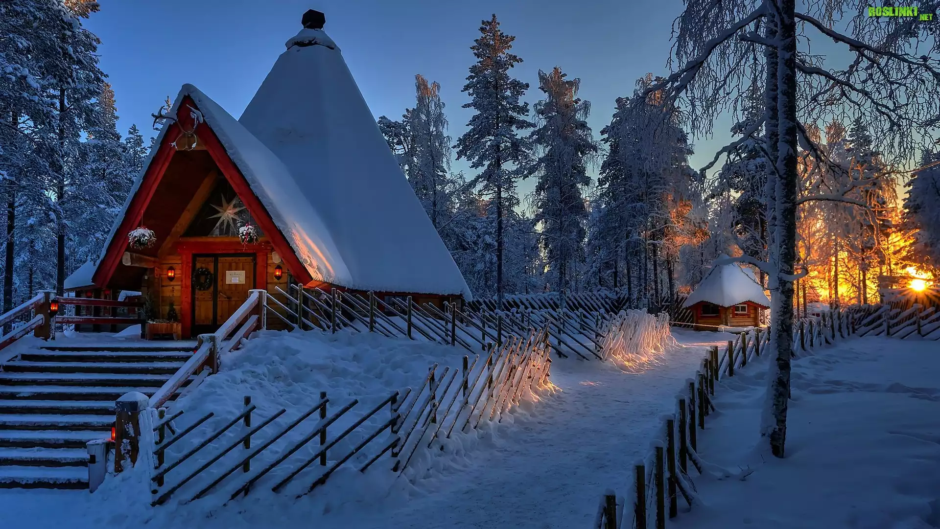 Rośliny: Zima, Domy, Ośnieżone, Drzewa, Ogrodzenie, Schody, Słońce