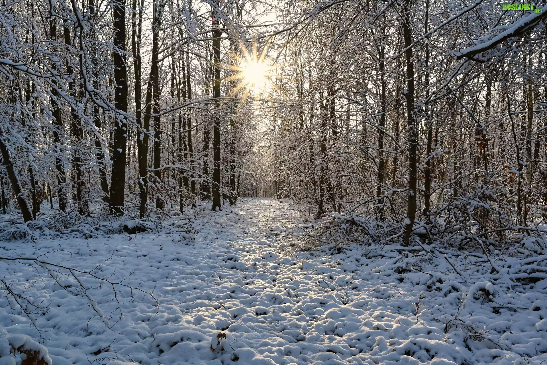 Rośliny: Zima, Las, Ośnieżone, Drzewa, Śnieg, Promienie słońca