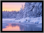 Zima, Rzeka, Ośnieżone, Drzewa, Zachód słońca, Zaspy