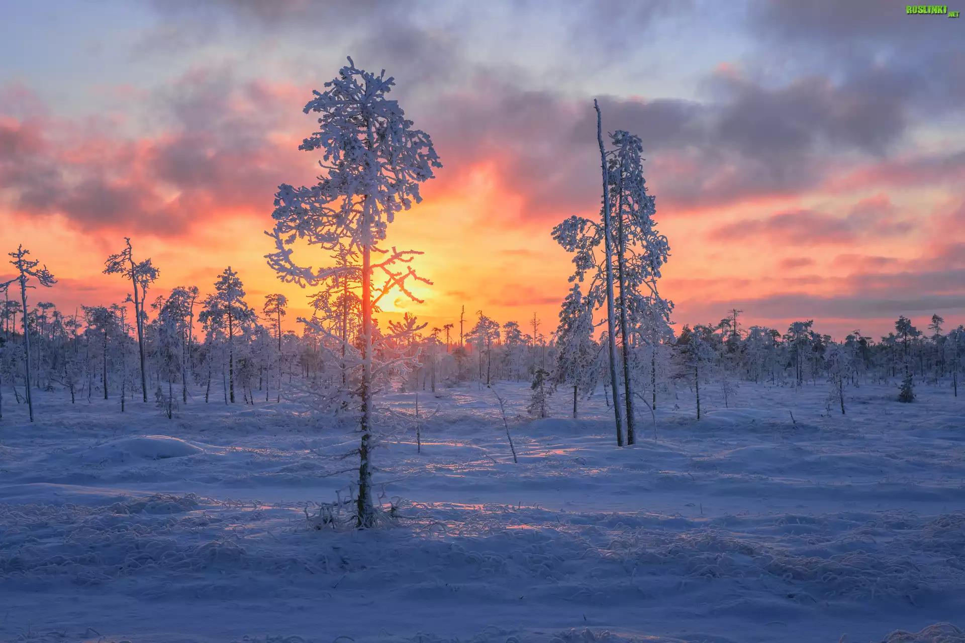 Rośliny: Zima, Śnieg, Ośnieżone, Drzewa, Zachód słońca, Chmury
