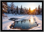 Zima, Śnieg, Ośnieżone, Drzewa, Promienie słońca, Jezioro