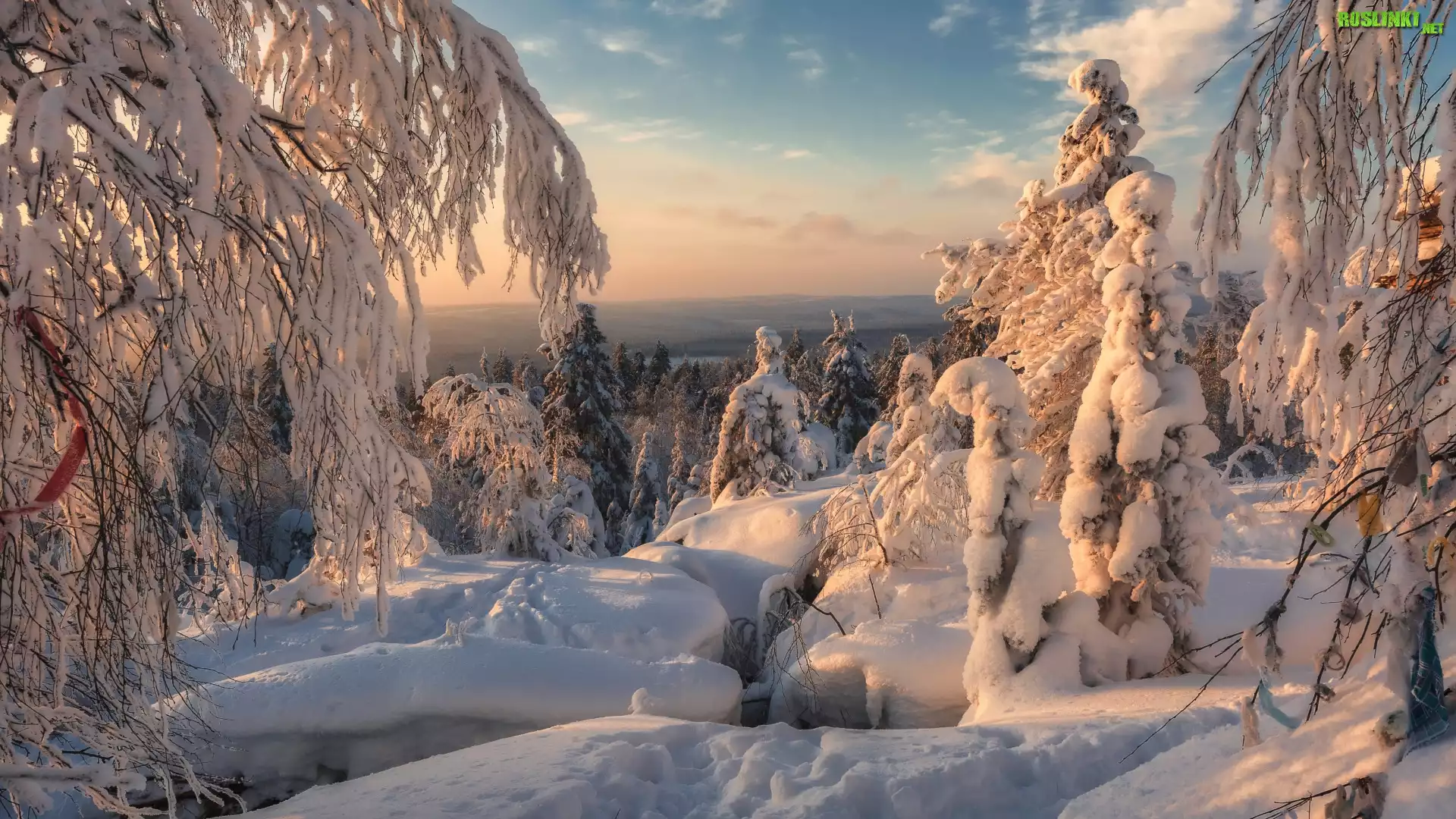 Rośliny: Zima, Śnieg, Ośnieżone, Drzewa, Góry, Zachód słońca