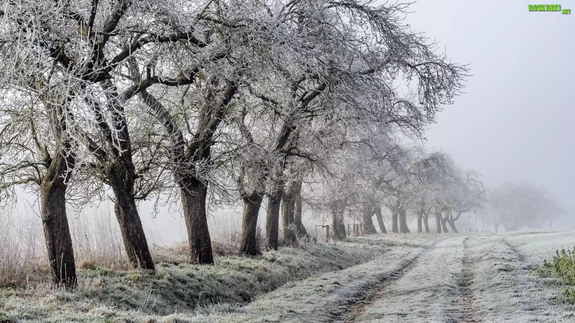 Rośliny: Zima, Droga, Oszronione, Drzewa, Trawa, Mgła, Poranek