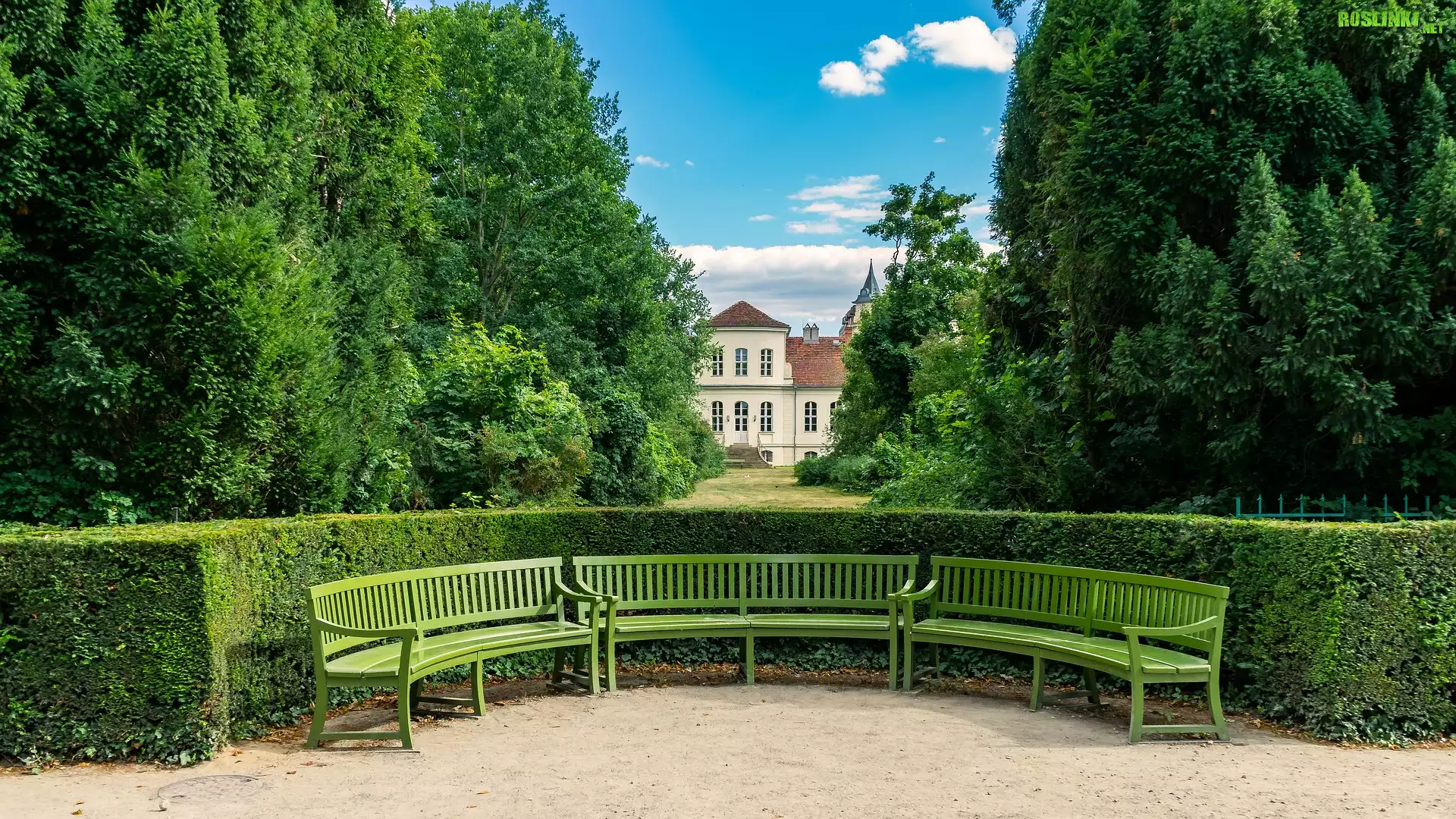 Rośliny: Ławka, Park, Dom, Drzewa, Krzewy