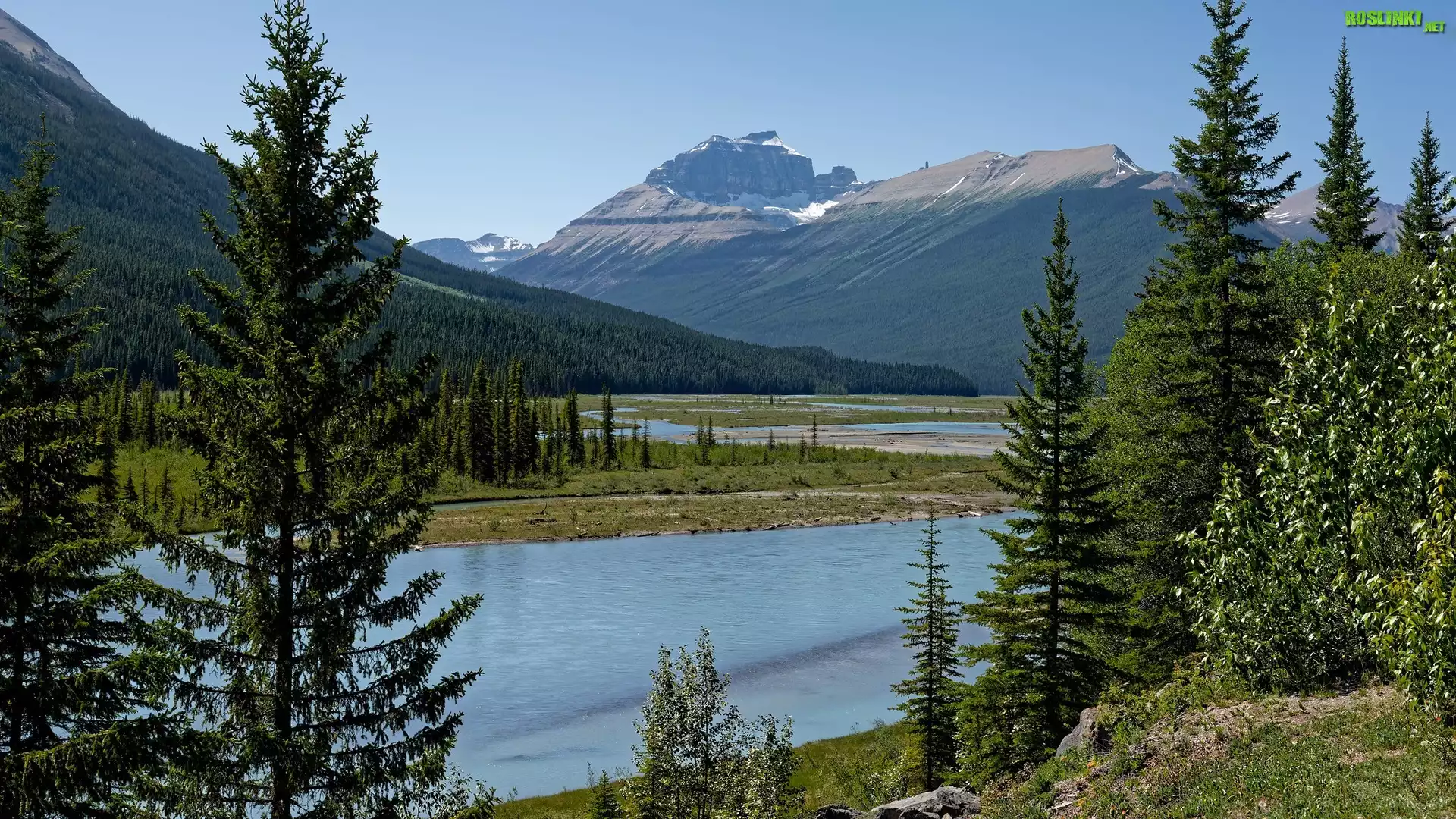 Rośliny: Góry, Canadian Rockies, Rzeka, Saskatchewan River, Drzewa, Park Narodowy Banff, Kanada