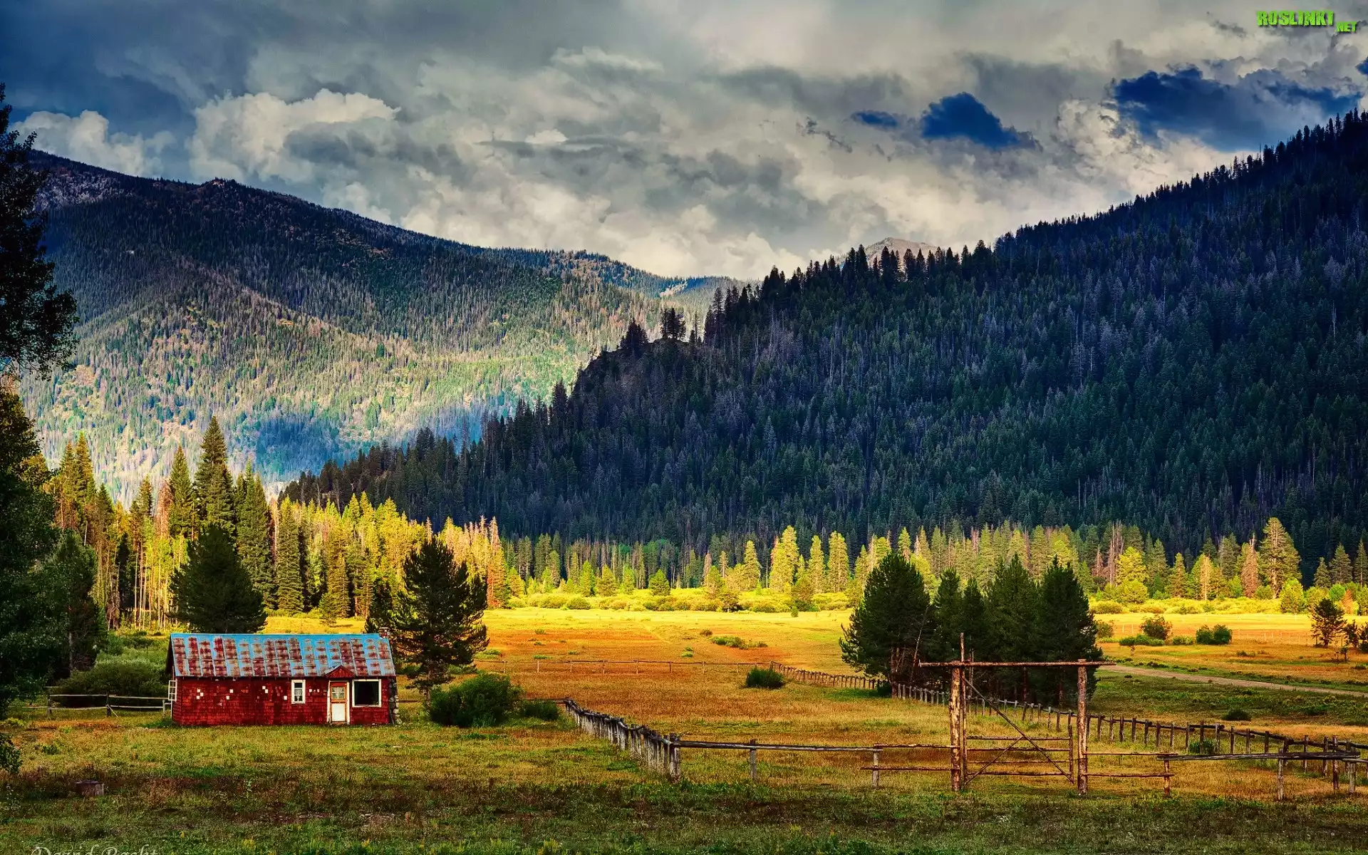 Rośliny: Góry, Drzewa, Pole, Czerwony, Dom, Chmury, Drewniany, Płot