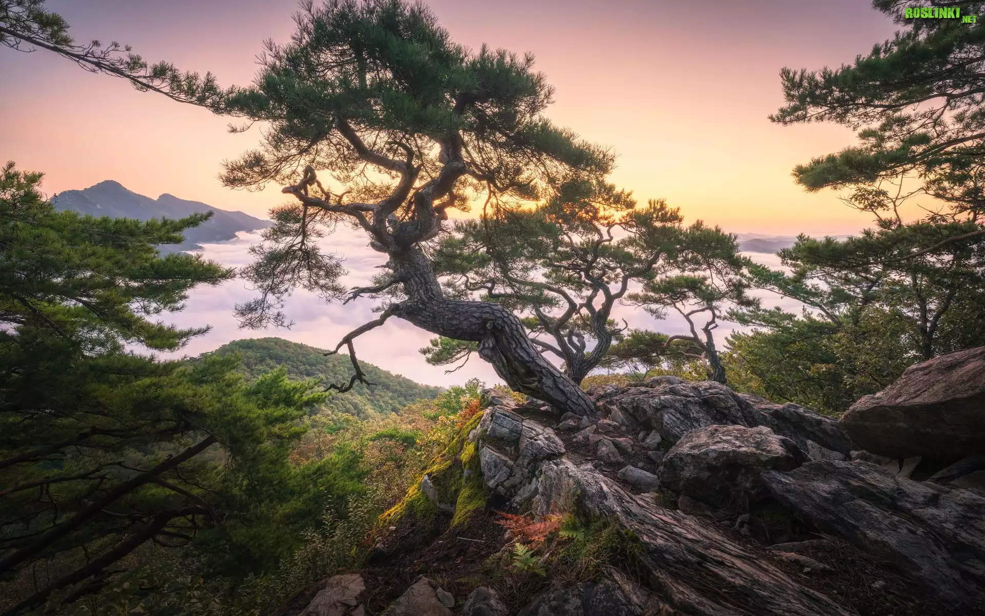 Rośliny: Góry, Skały, Mgła, Drzewa, Sosny, Pochylone