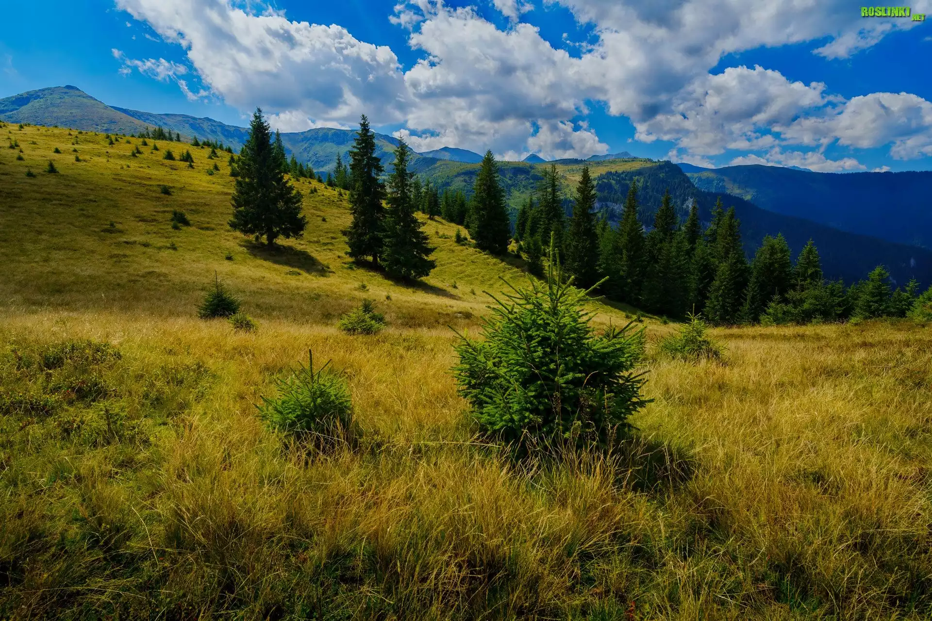 Rośliny: Góry, Drzewa, Polana, Trawa, Chmury