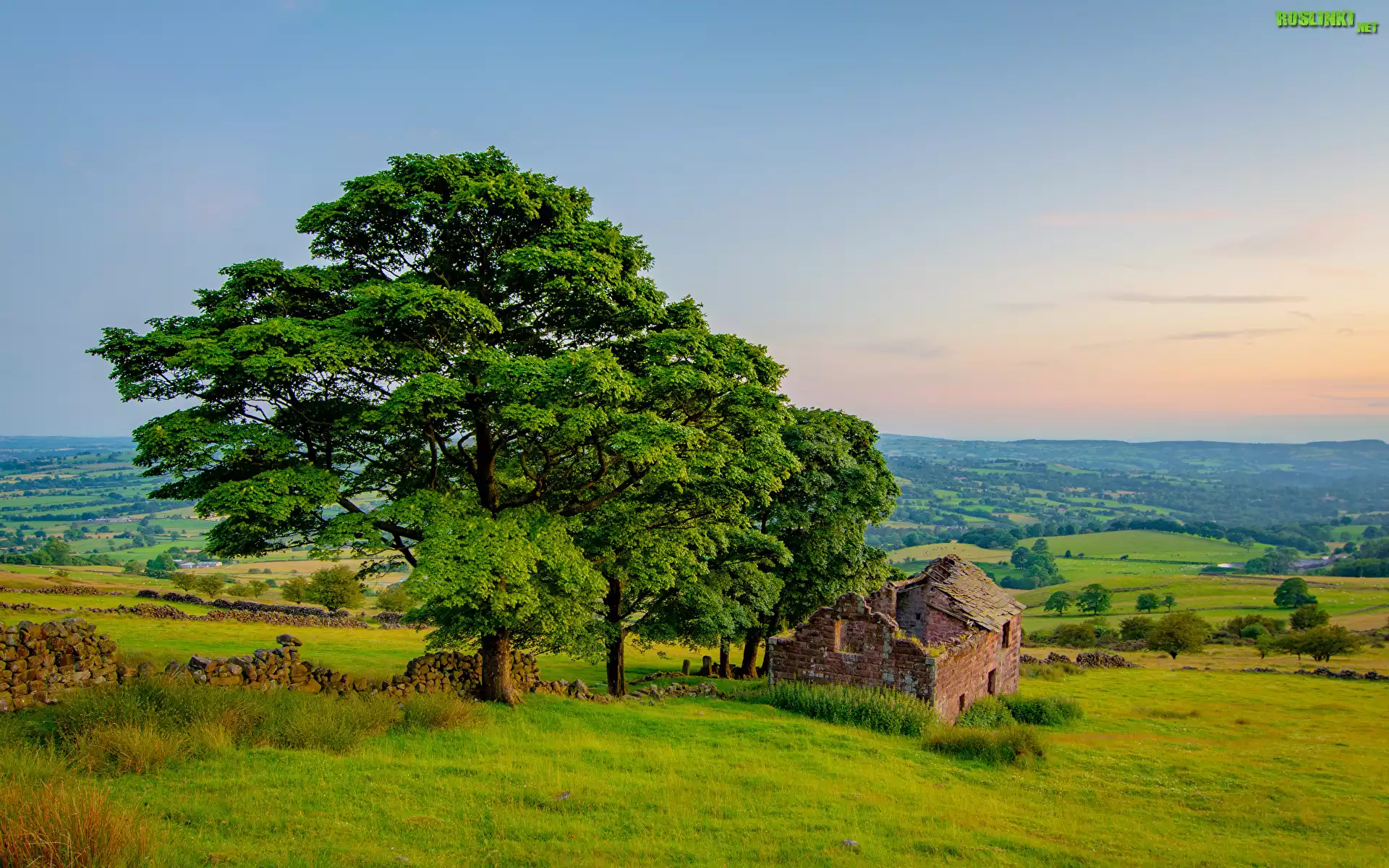 Rośliny: Pole, Drzewa, Dom, Ruiny, Murek, Zachód słońca