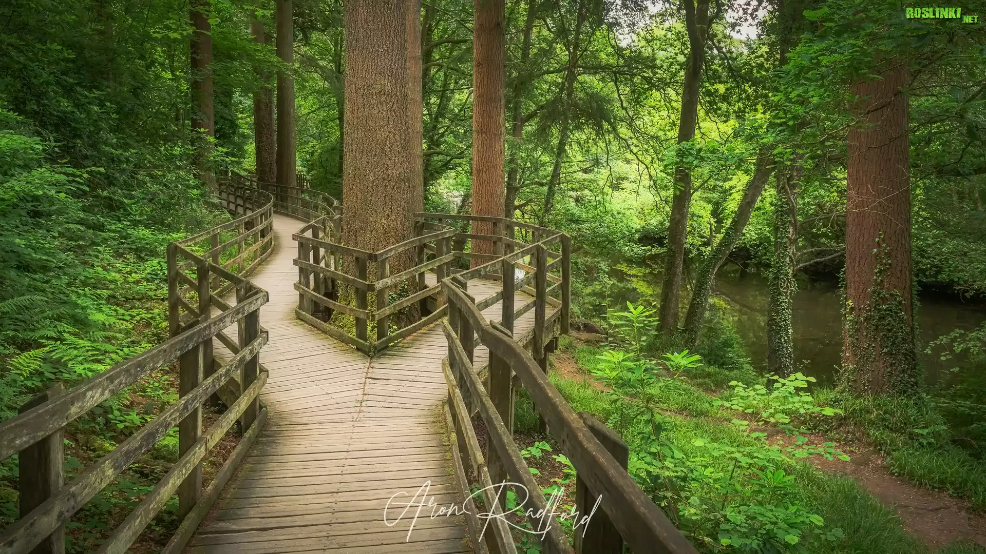 Rośliny: Las, Drzewa, Pomost, Barierki, Rzeka