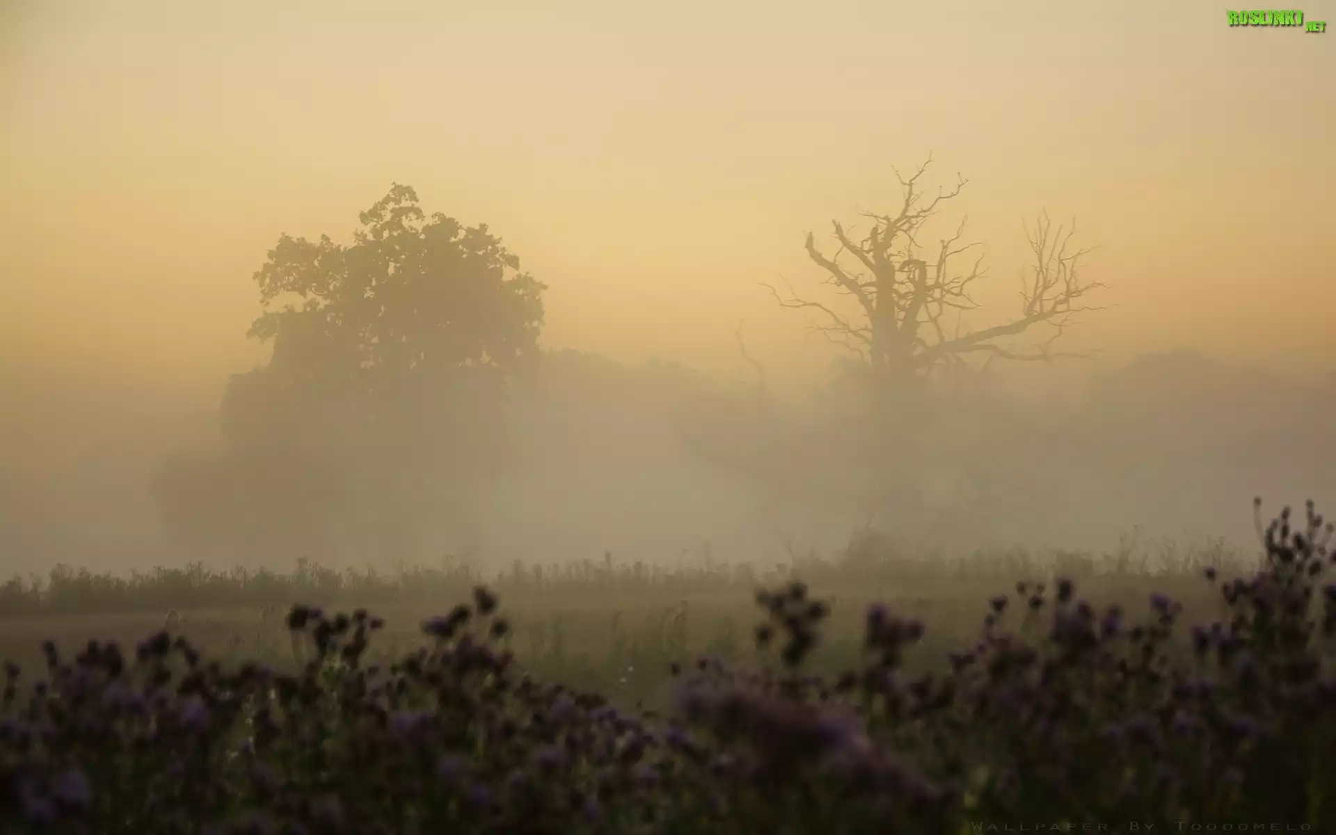 Rośliny: Drzewa, Dęby, Łąka, Mgła, Poranek, Zarośla