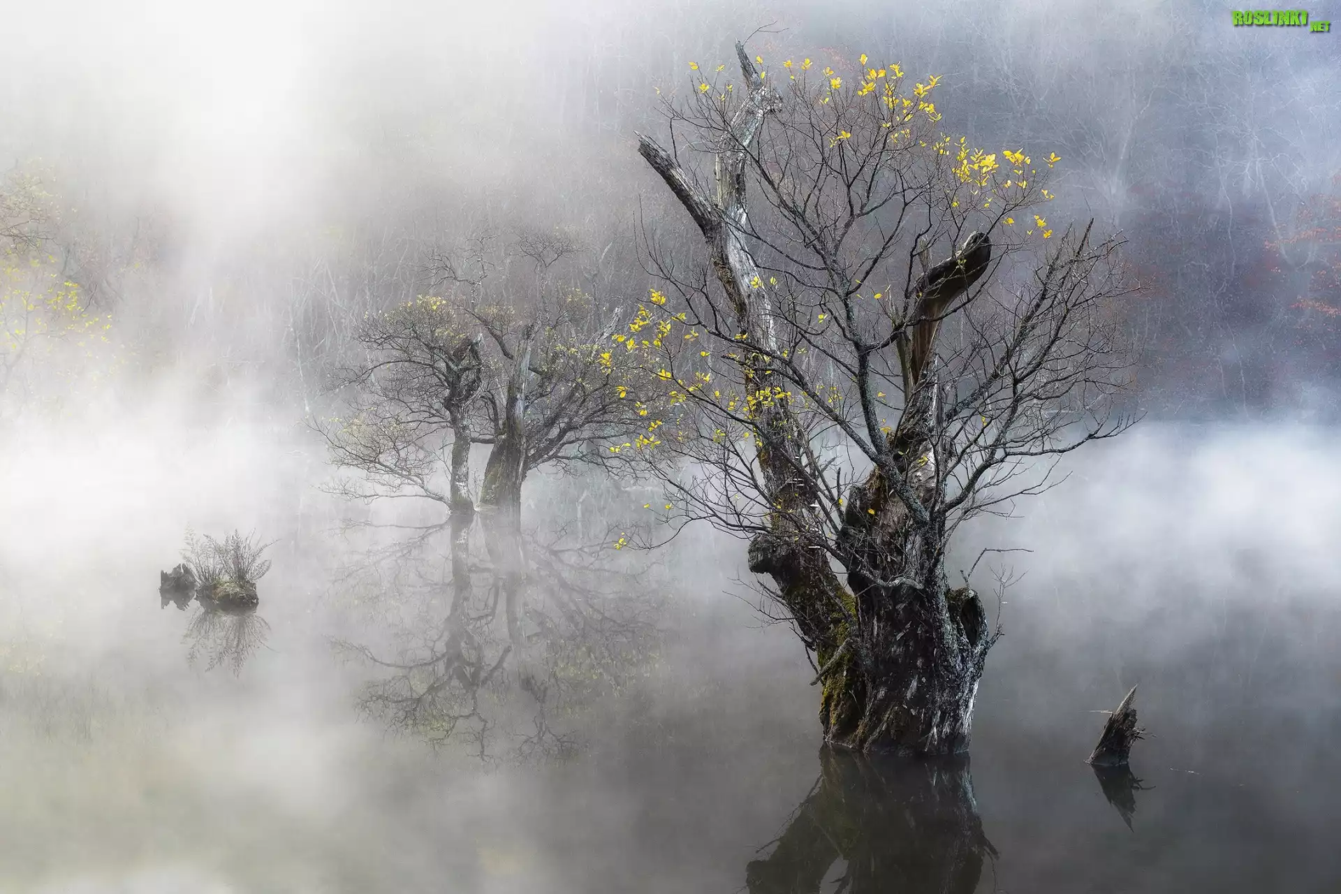 Rośliny: Drzewa, Jezioro, Poranek, Mgła