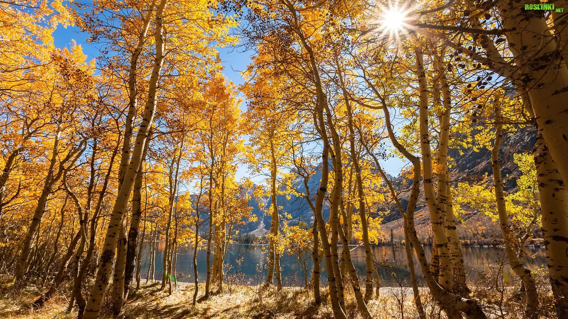 Rośliny: Drzewa, Brzozy, Góry, Jezioro, Promienie słońca