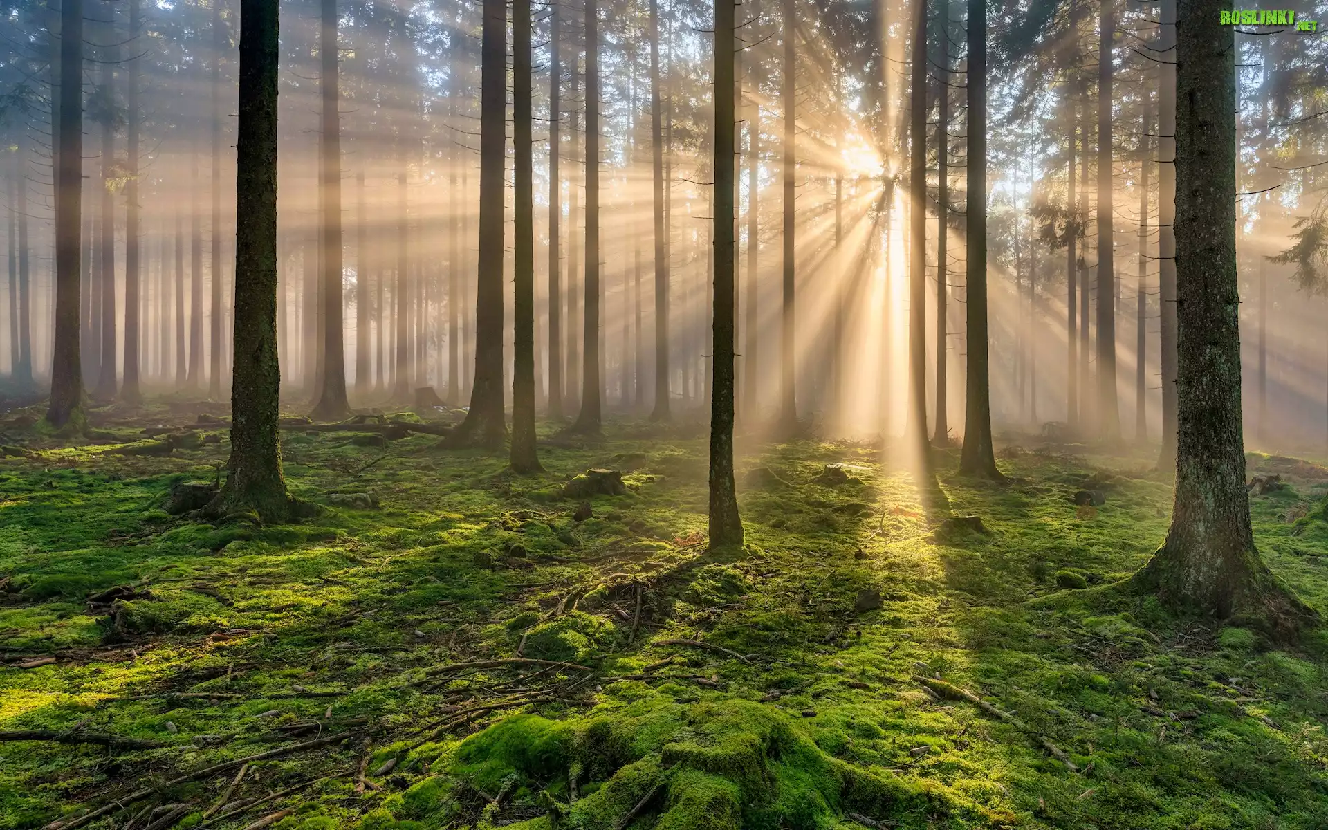 Rośliny: Las, Drzewa, Przebijające światło, Mech