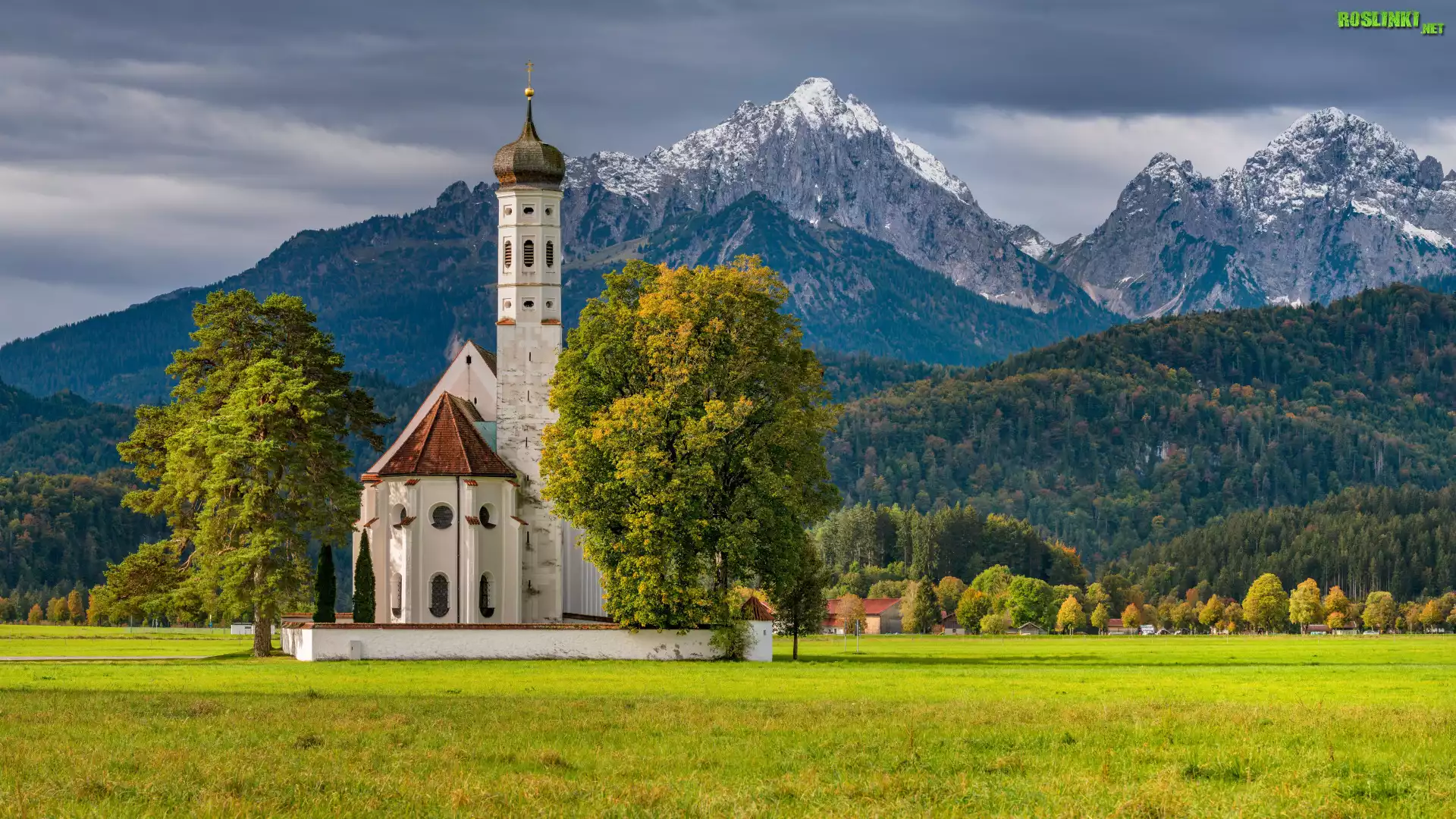 Rośliny: Góry, Alpy, Kościół, Eglise Saint Coloman, Drzewa, Region Allgau, Bawaria, Niemcy