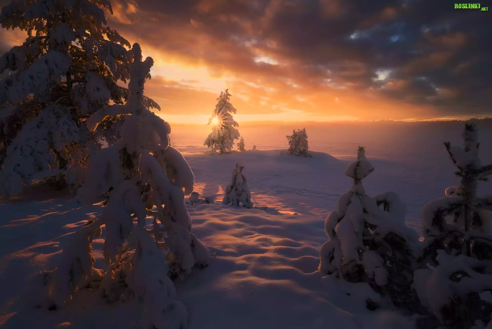 Rośliny: Norwegia, Gmina Ringerike, Zachód słońca, Zima, Zaśnieżone, Jezioro, Drzewa