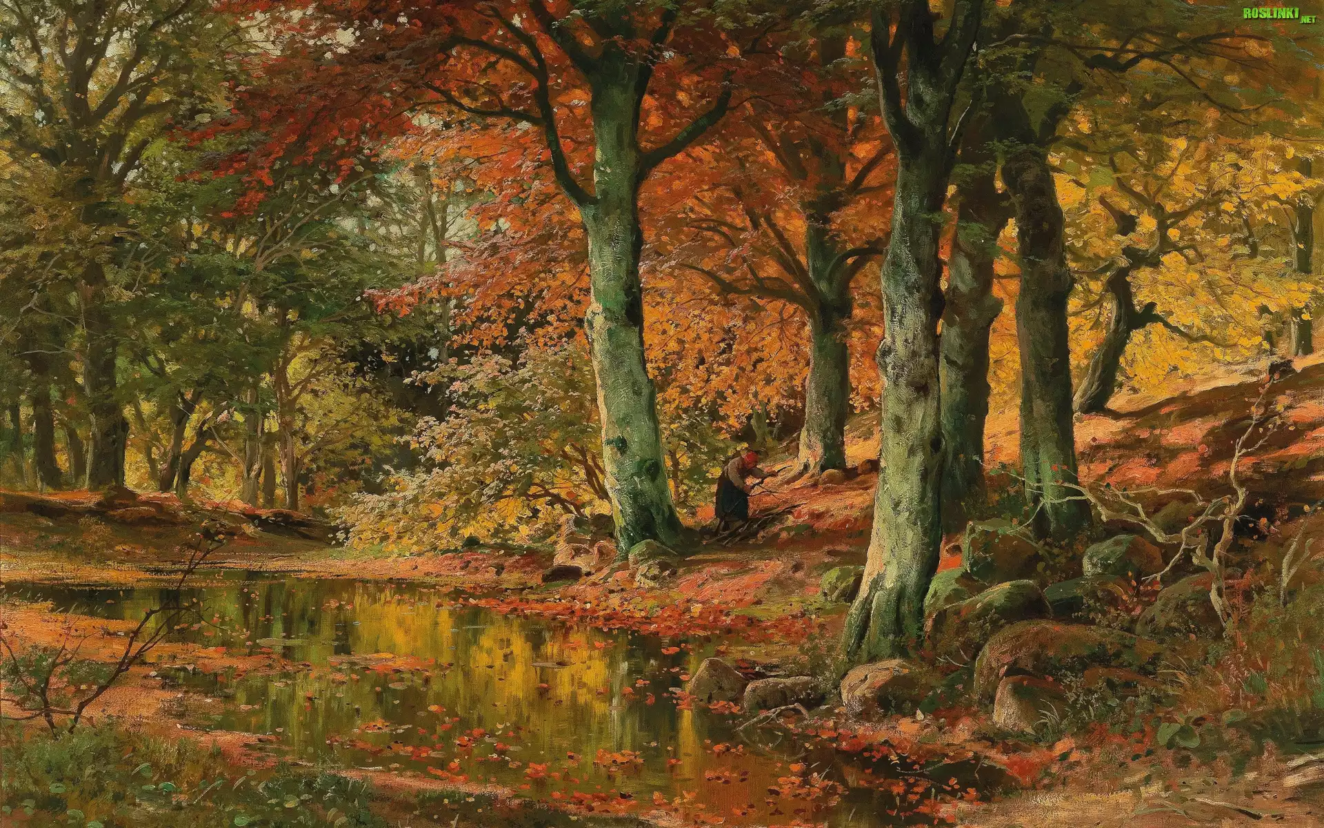 Rośliny: Jesień, Las, Drzewa, Liście, Rzeka, Kamienie, Kobieta, Malarstwo, Obraz, Alois Arnegger