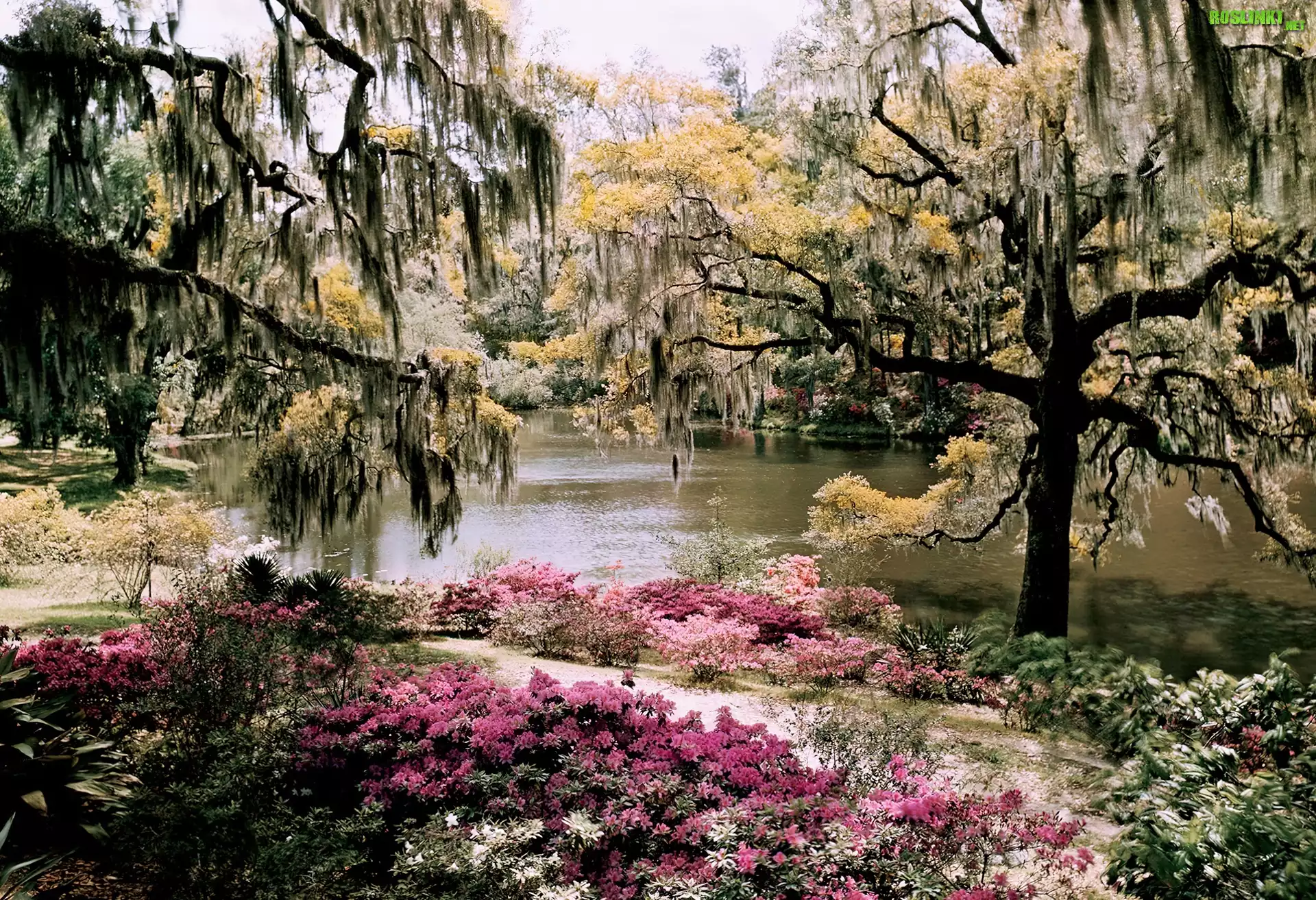 Rzeka, Drzewa, Kwiaty