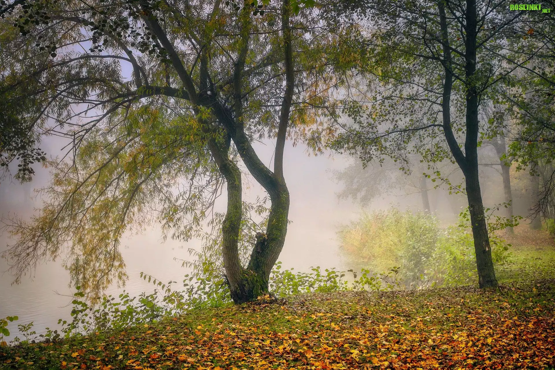 Rośliny: Drzewa, Opadłe, Liście, Rzeka, Mgła