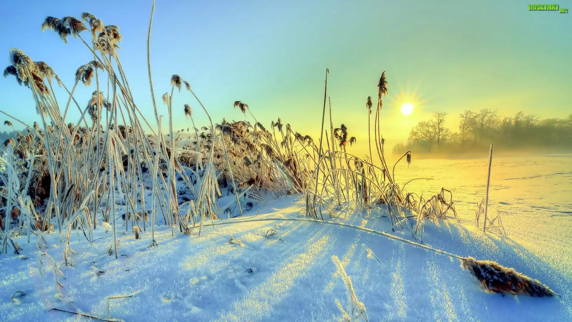 Rośliny: Rzeka, Drzewa, Trawy, Promienie słońca, Zima, Mgła