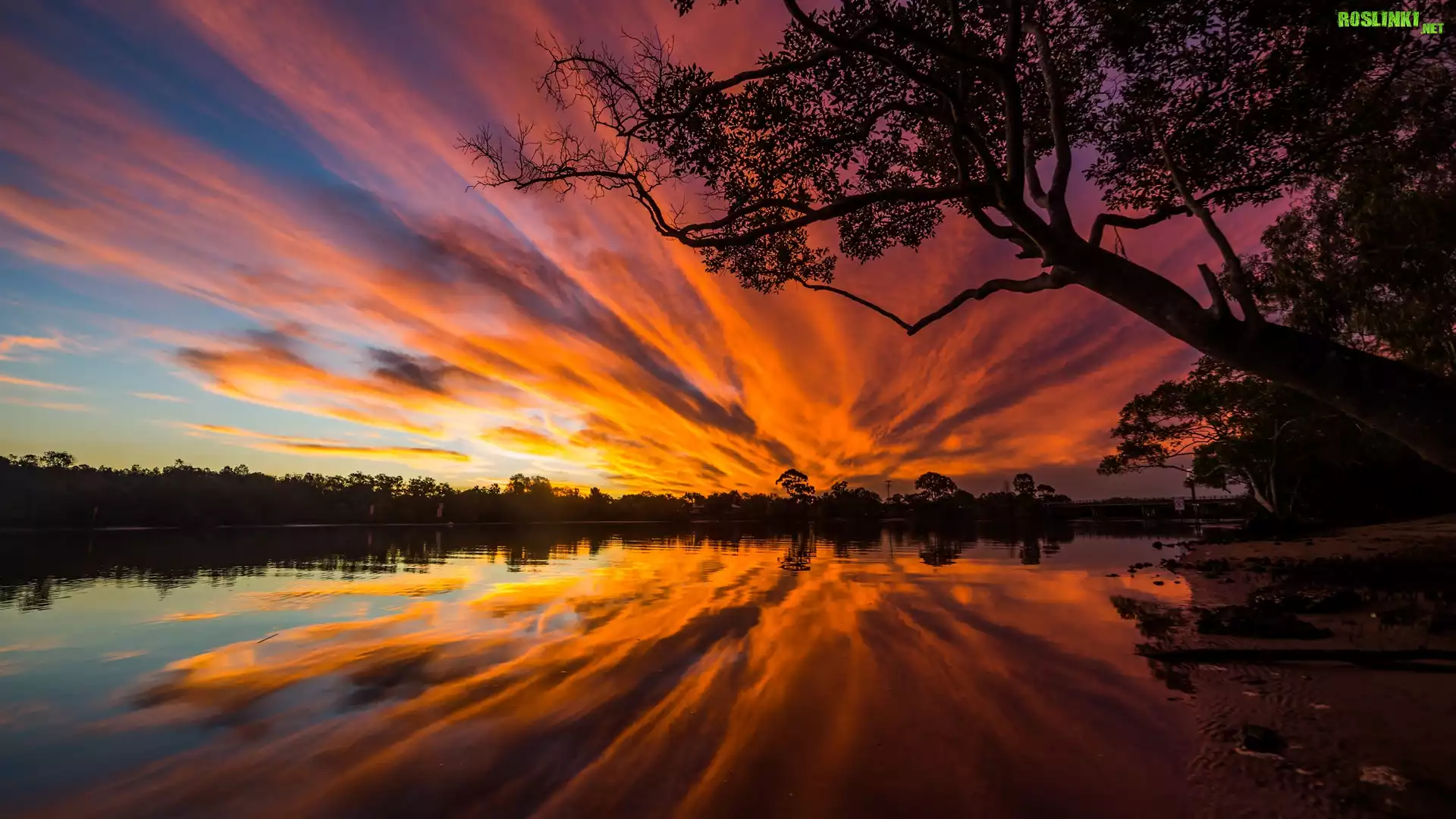 Rośliny: Rzeka, Drzewa, Zachód słońca, Niebo, Chmury, Odbicie