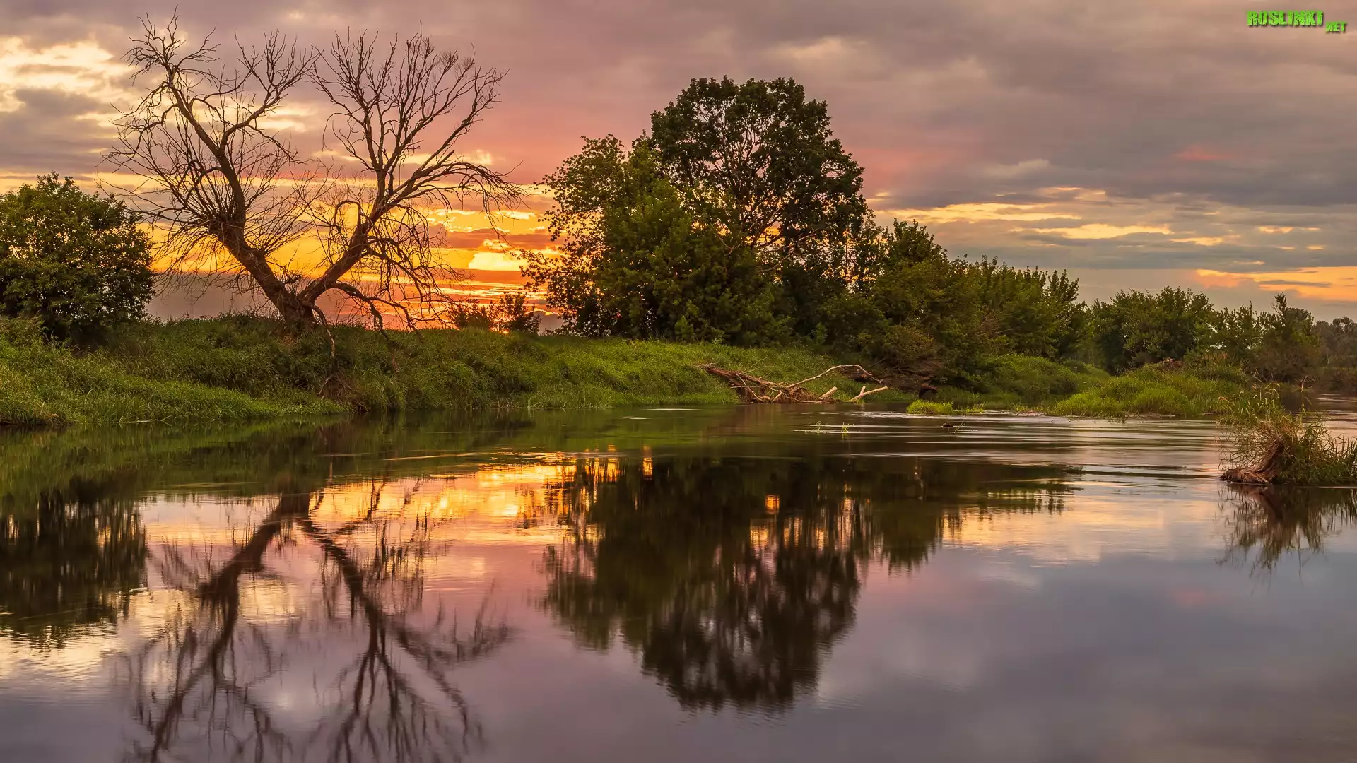Rośliny: Rzeka, Drzewa, Krzewy, Zachód słońca, Chmury, Odbicie