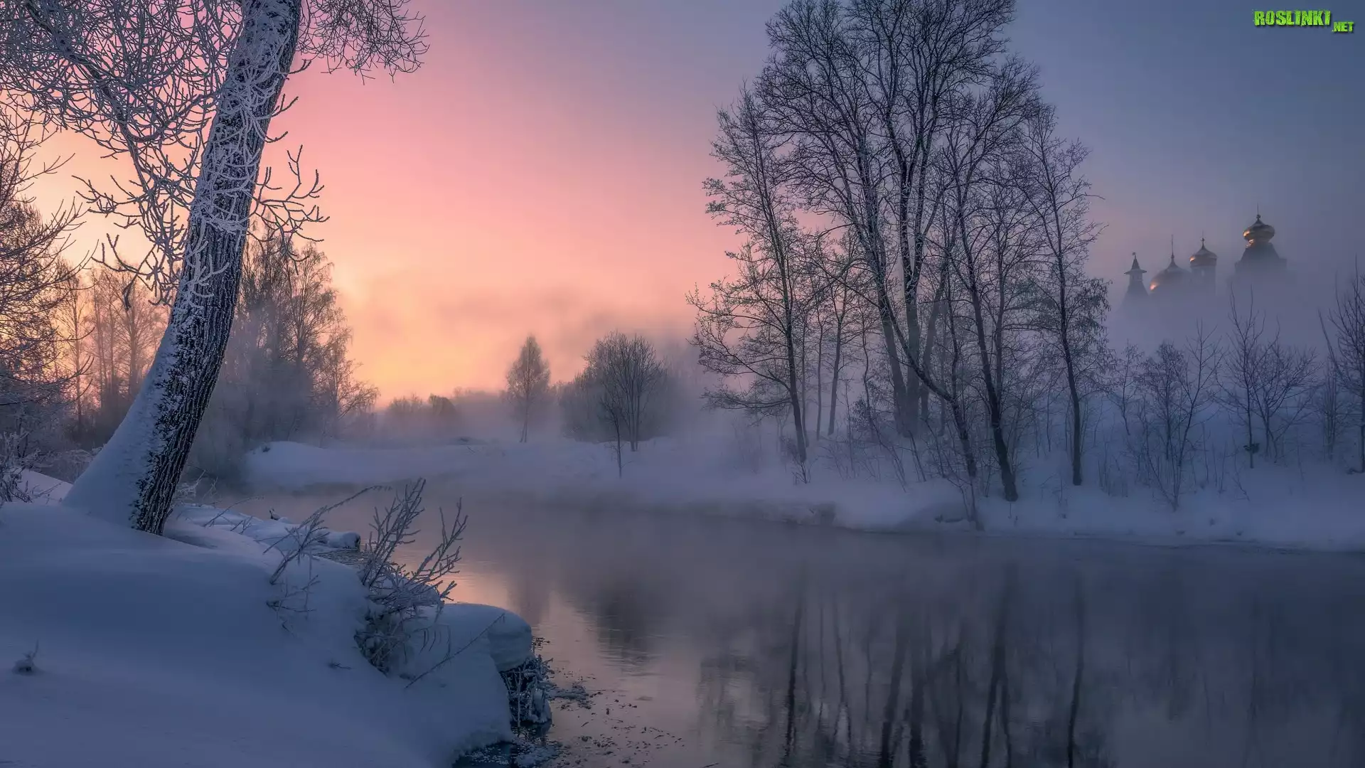Rośliny: Zima, Poranek, Rzeka, Mgła, Drzewa, Cerkiew, Wieże, Drzewa