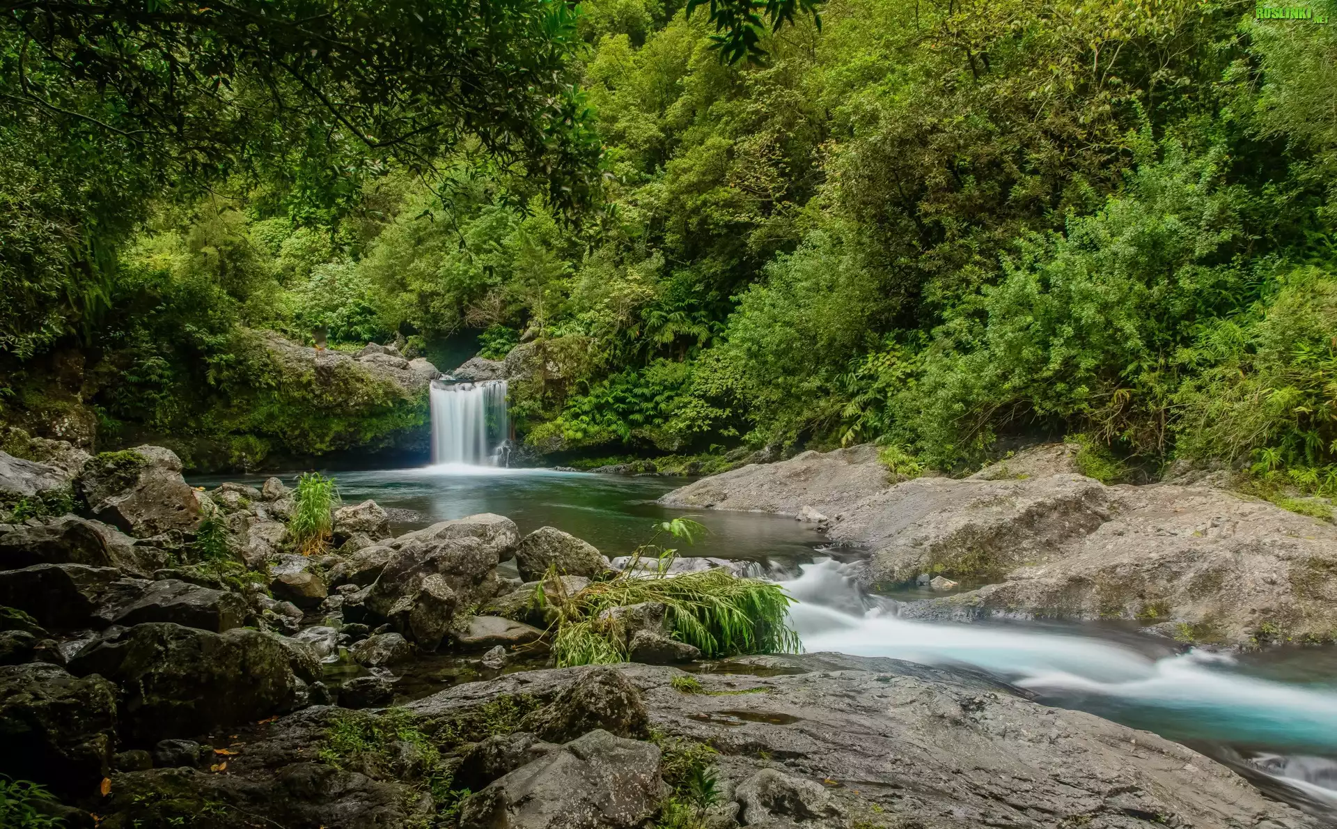Rośliny: Drzewa, Las, Wodospad, Rzeka, Kamienie