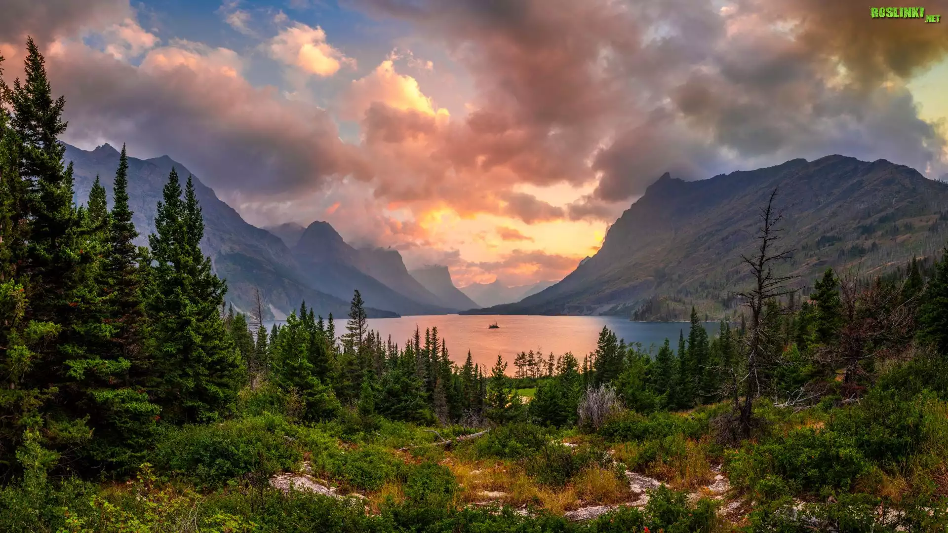 Park Narodowy Glacier, Jezioro, Saint Mary Lake, Góry, Drzewa, Krzewy, Niebo, Chmury, Stany Zjednoczone |